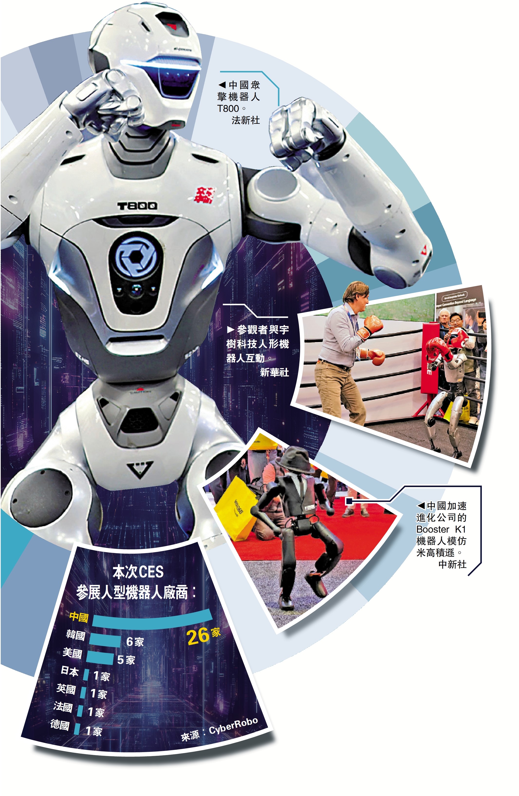當地時間1月6日至9日,被視為全球科技年度風向標的2026年國際消費電子展(CES)在美國拉斯維加斯舉辦。本屆展會的核心主題是「以人為本」,聚焦人工智能(AI)、數字健康、能源技術、企業技術、移動技術和機器人等前沿科技趨勢。今年的展覽變身機器人產品的全明星擂台賽,各式各樣的機器人各顯神通,中國企業成為當中的絕對主角。機器人不但在現場勁歌熱舞,還會煮咖啡、疊衣服、打乒乓球和發撲克牌。有些人型機器人「藝高『人』膽大」,在展廳擺擂台與人類參觀者一決高下。