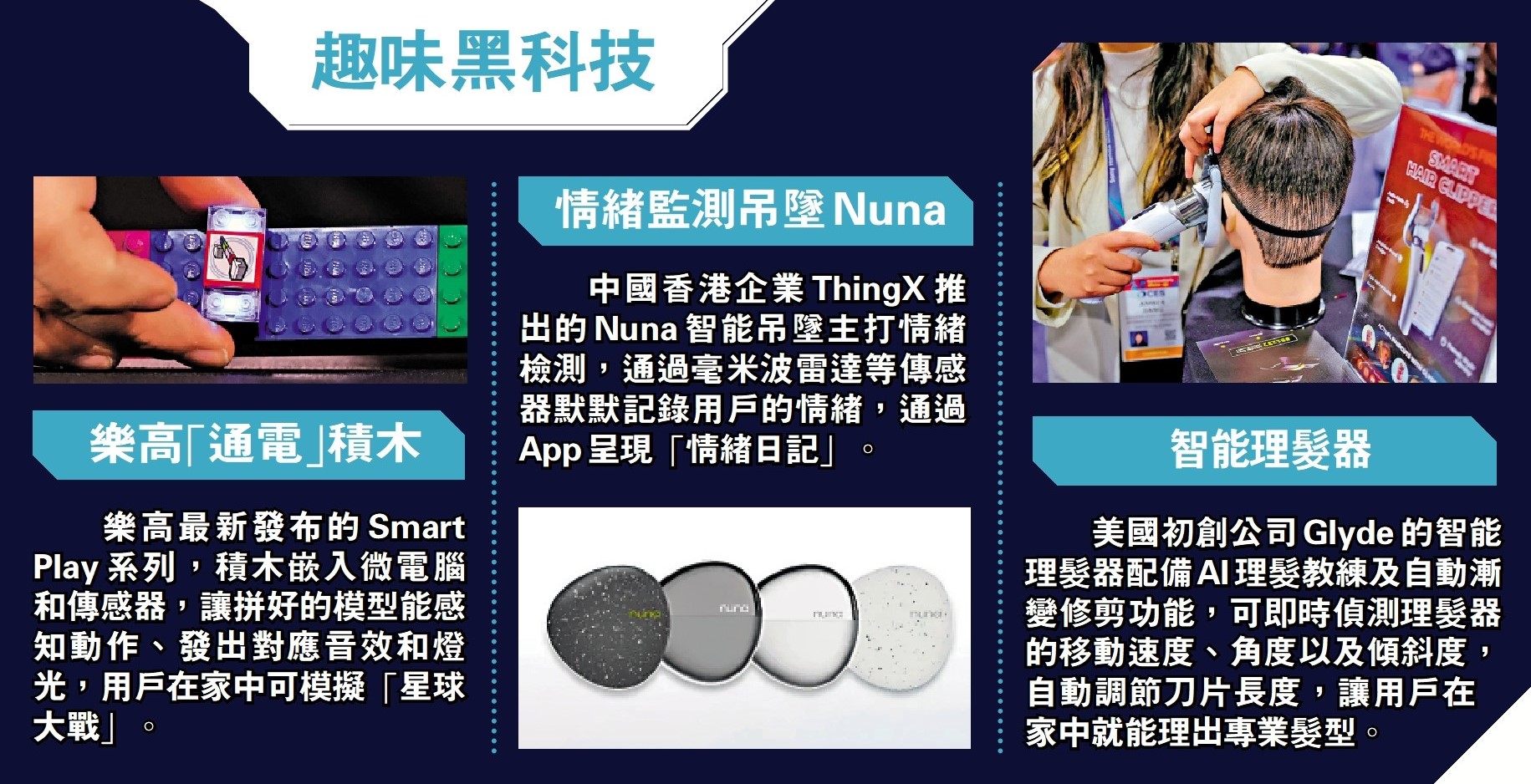 美國初創公司Glyde的智能理髮器配備AI理髮教練及自動漸變修剪功能,可即時偵測理髮器的移動速度、角度以及傾斜度,自動調節刀片長度,讓用戶在家中就能理出專業髮型。