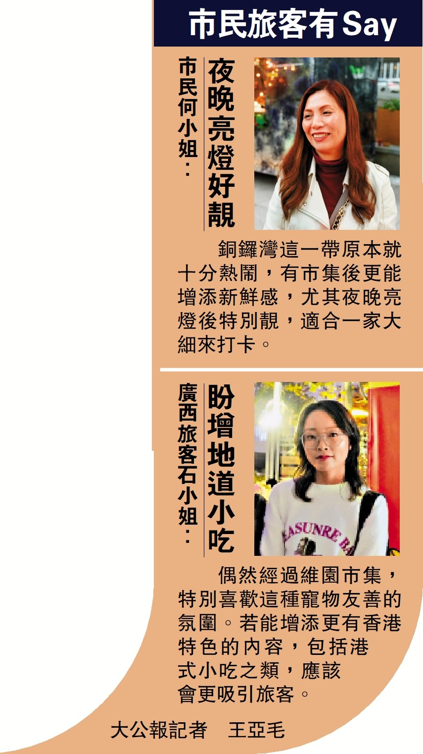偶然經過維園市集,特別喜歡這種寵物友善的氛圍。若能增添更有香港特色的內容,包括港式小吃之類,應該會更吸引旅客。