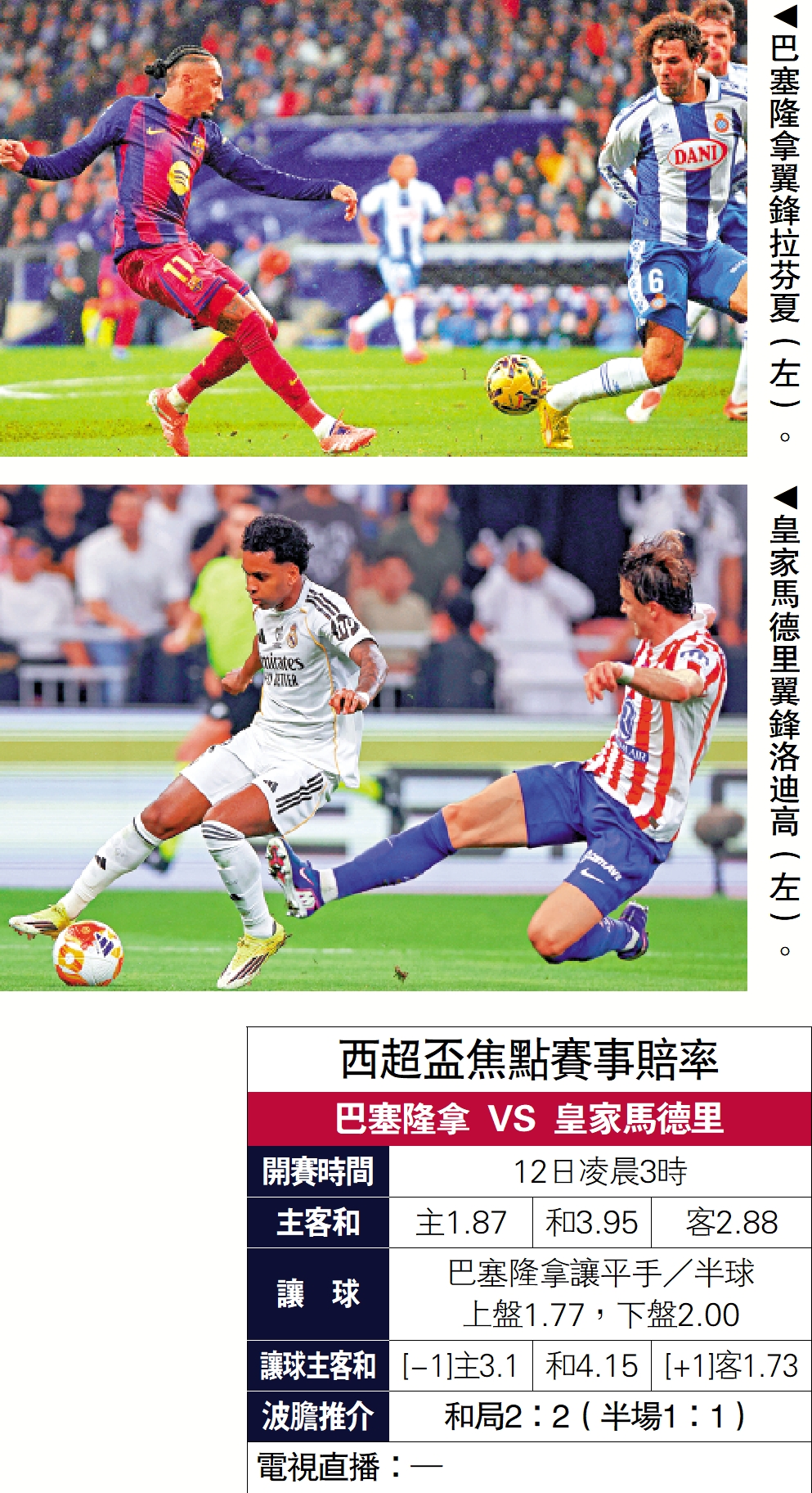 【大公報訊】記者張銳報道:西班牙超級盃決賽將於12日凌晨3時再度迎來經典的「西甲打吡」,由狀態火熱的巴塞隆拿與陣容底蘊深厚的皇家馬德里爭奪本季首項錦標。巴塞隆拿的整體性與戰術執行力略佔上風,但皇馬擁有出色的球星個人能力與豐富的大賽經驗。最終勝負,很可能取決於臨場的細節把握與關鍵球員的發揮。預計場面將一如以往地火爆,可能需互射12碼爭勝負。