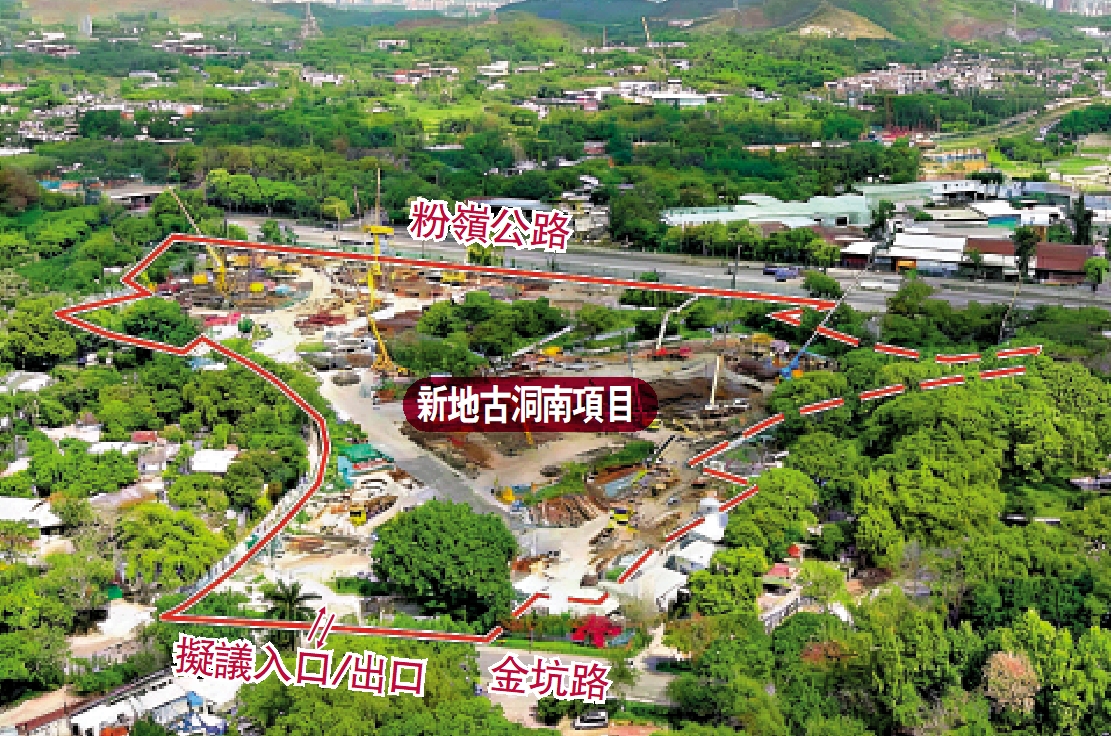 該個古洞南項目位於粉嶺公路與金坑路之間,附近是新地多年前發展的大型洋房屋苑天巒,地盤面積約40.43萬方呎。