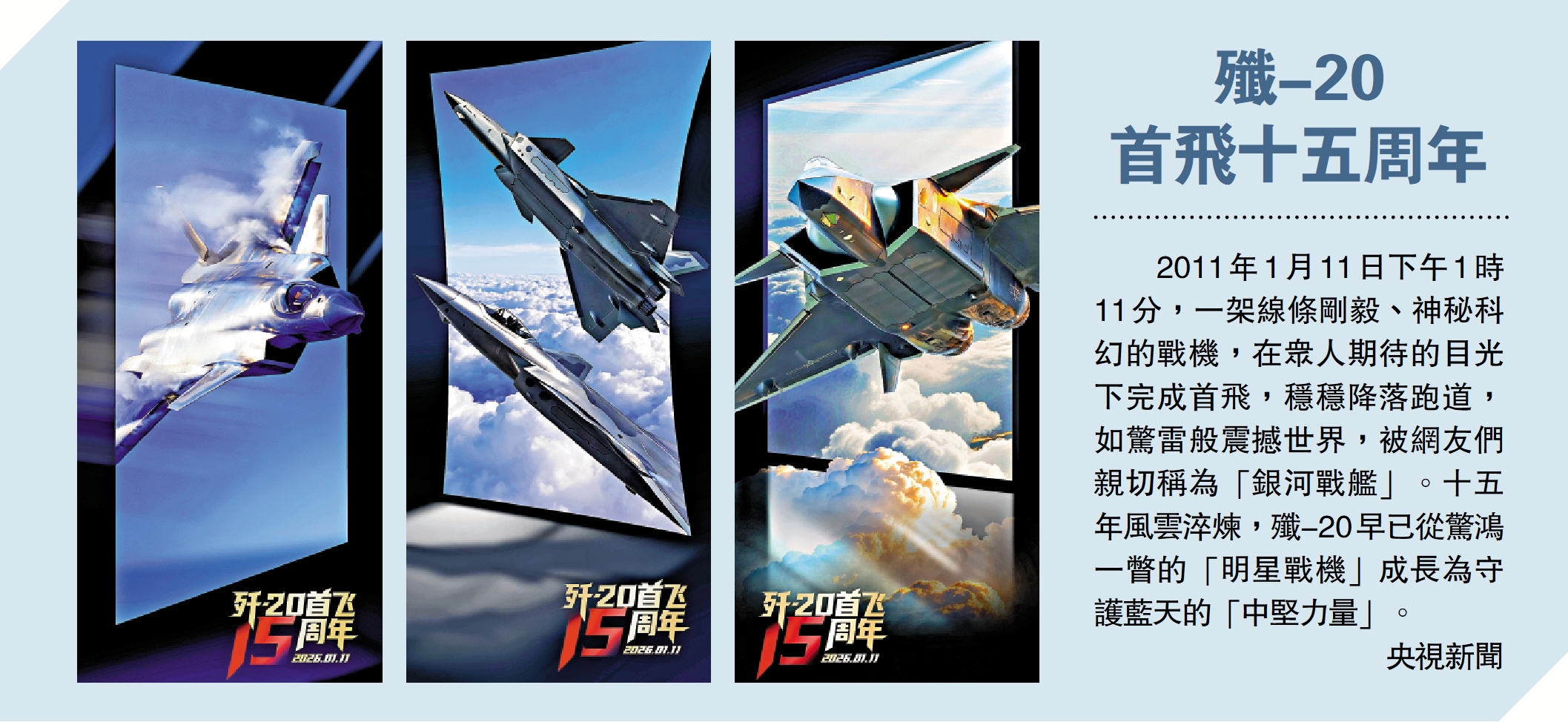 2011年1月11日下午1時11分,一架線條剛毅、神秘科幻的戰機,在眾人期待的目光下完成首飛,穩穩降落跑道,如驚雷般震撼世界,被網友們親切稱為「銀河戰艦」。十五年風雲淬煉,殲-20早已從驚鴻一瞥的「明星戰機」成長為守護藍天的「中堅力量」。\央視新聞