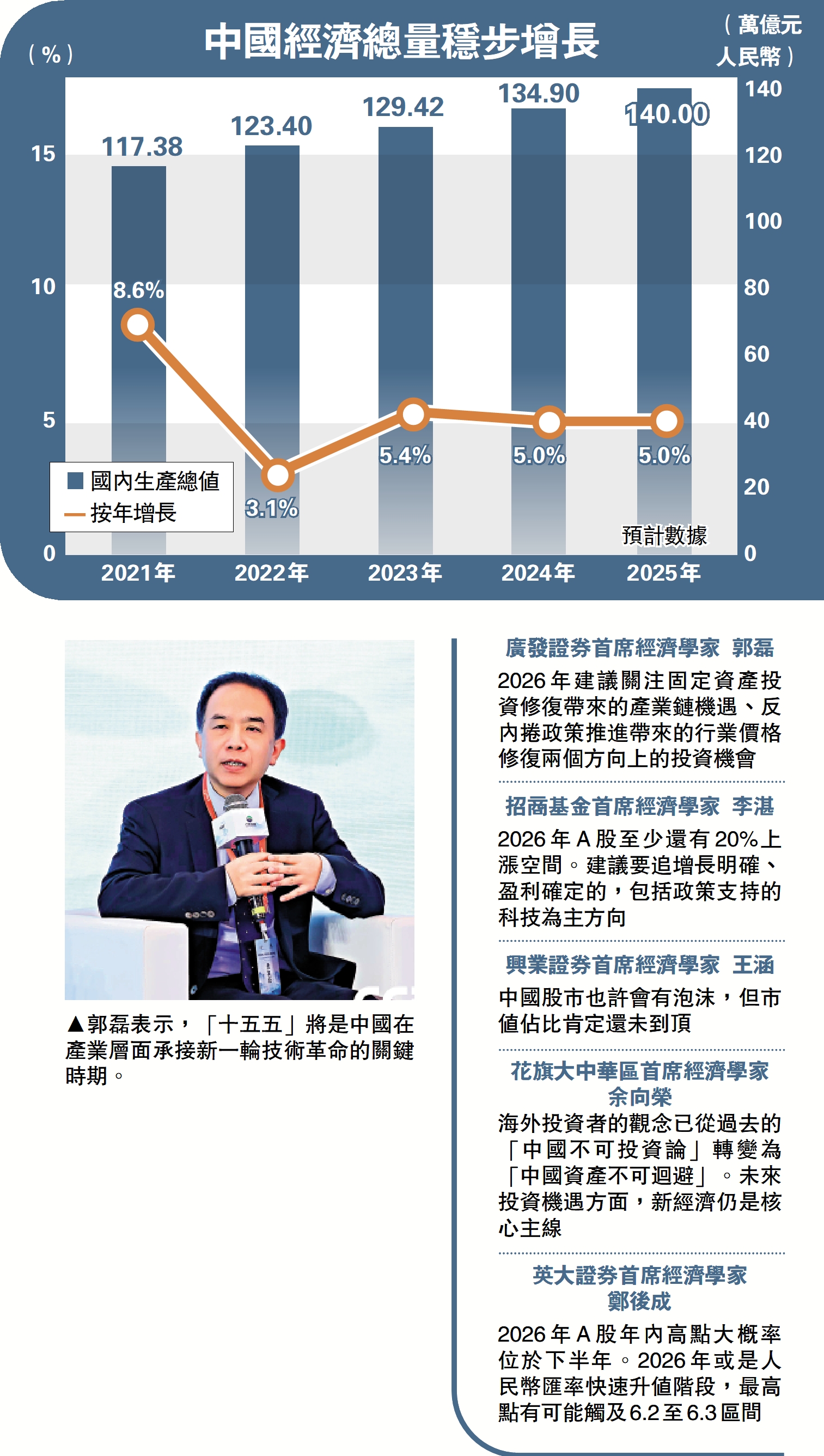全球第六輪技術革命已拉開序幕,可再生能源、人工智能、具身智能等成為前沿方向,廣發證券首席經濟學家郭磊表示,「十五五」將是中國在產業層面承接新一輪技術革命的關鍵時期,可留意新興市場出口及人工智能(AI)應用等機遇。此外,多位經濟學家預計人民幣新一年將保持平穩向好。其中,英大證券首席經濟學家鄭後成預測,人民幣匯率快速升值的進程或延續到2027年,最高點或觸及6.2至6.3區間。申萬宏源首席經濟學家趙偉估計未來十年,人民幣累計或有三成升幅。\大公報記者 彭巧容