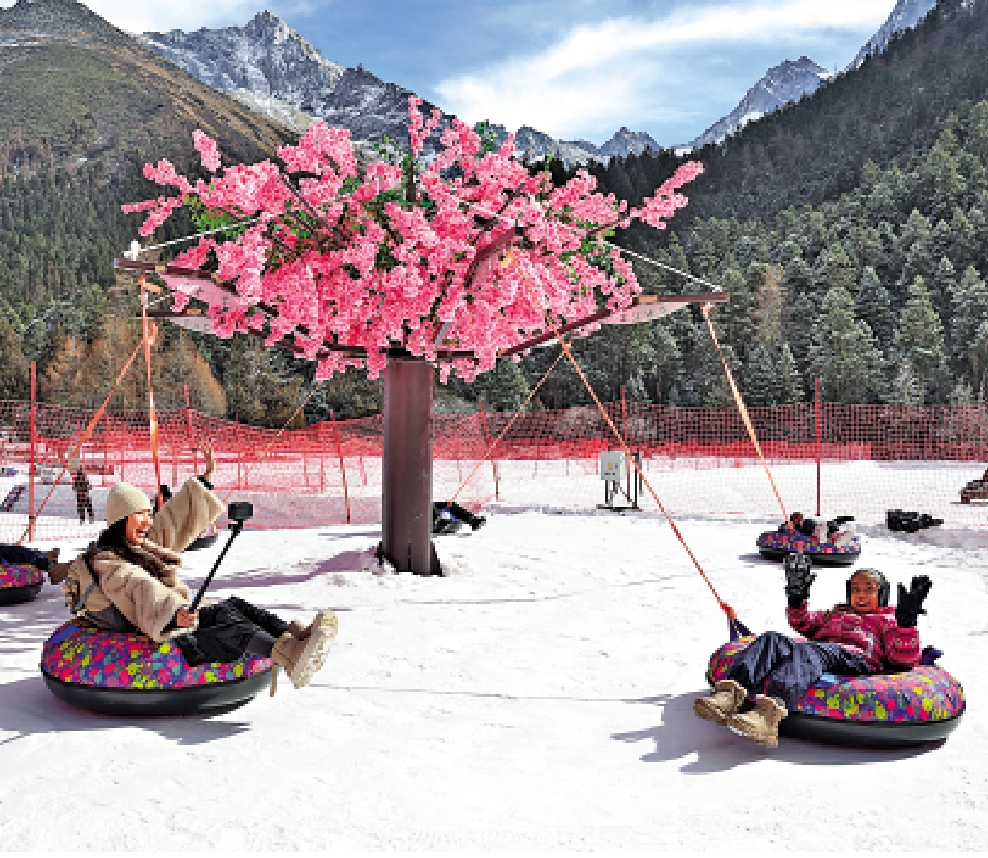 近日,四川省迎來新一年冰雪季。自然生態景區變身冰雪世界,全省十九個雪場也成為冰雪愛好者們的天堂。圖為中外遊客在四川省理縣畢棚溝滑雪場遊玩。\新華社