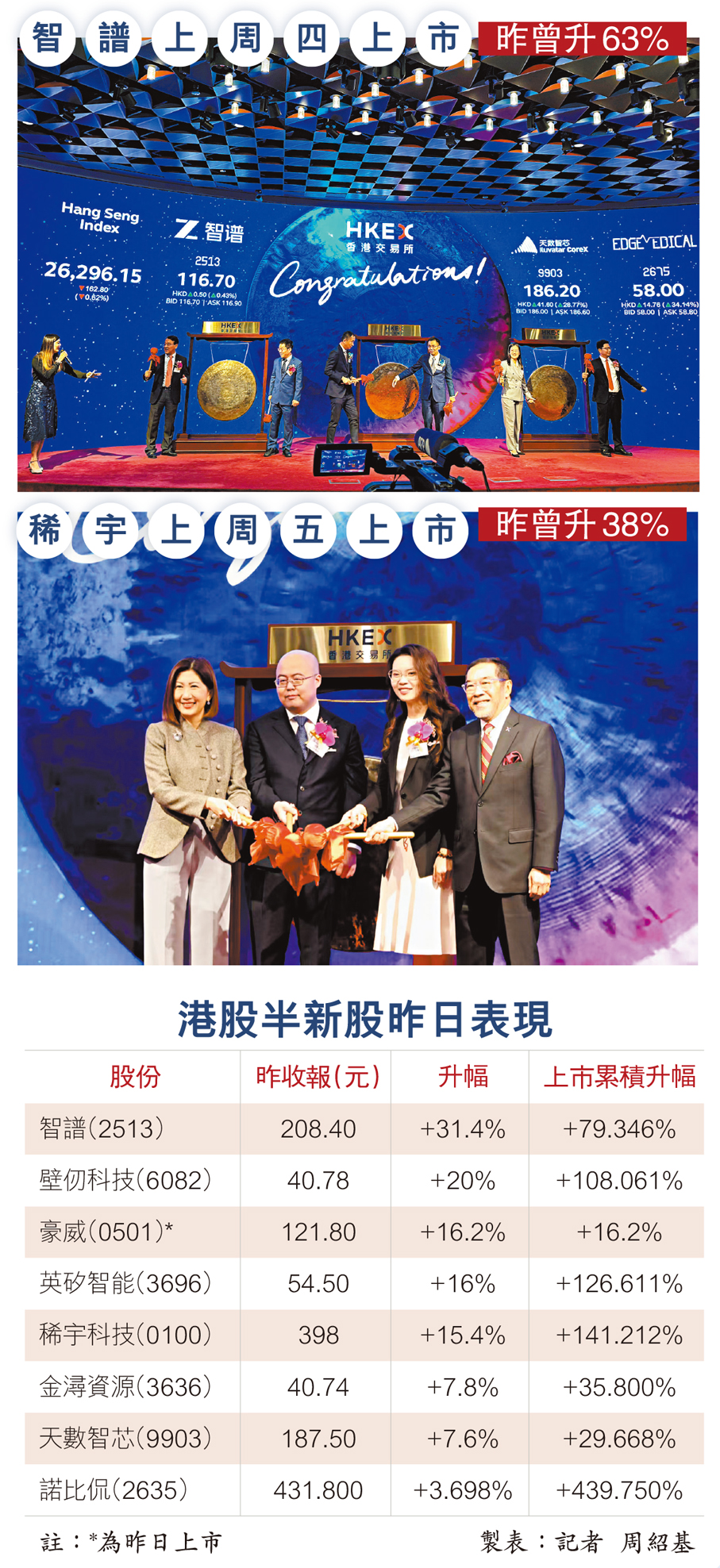 AI應用概念人氣繼續爆發,港股及A股的AI概念股全線飆升。港股中,昨日首日掛牌的內地半導體設計公司豪威集團(0501)收報121.8元,較招股價高出16.2%。半新股內地「AI六小虎」中的「雙雄」智譜(2513)和稀宇科技(MiniMax,0100)昨日更是狂飆,分別曾升逾六成和近四成。另外,彭博引述消息指,從事腦機接口技術研發的強腦科技,將以保密形式向港交所(0388)提交上市申請。若成功上市,有望成為「杭州六小龍」中首間在港掛牌的股份,顯示資金仍大量往高新科技板塊流動。