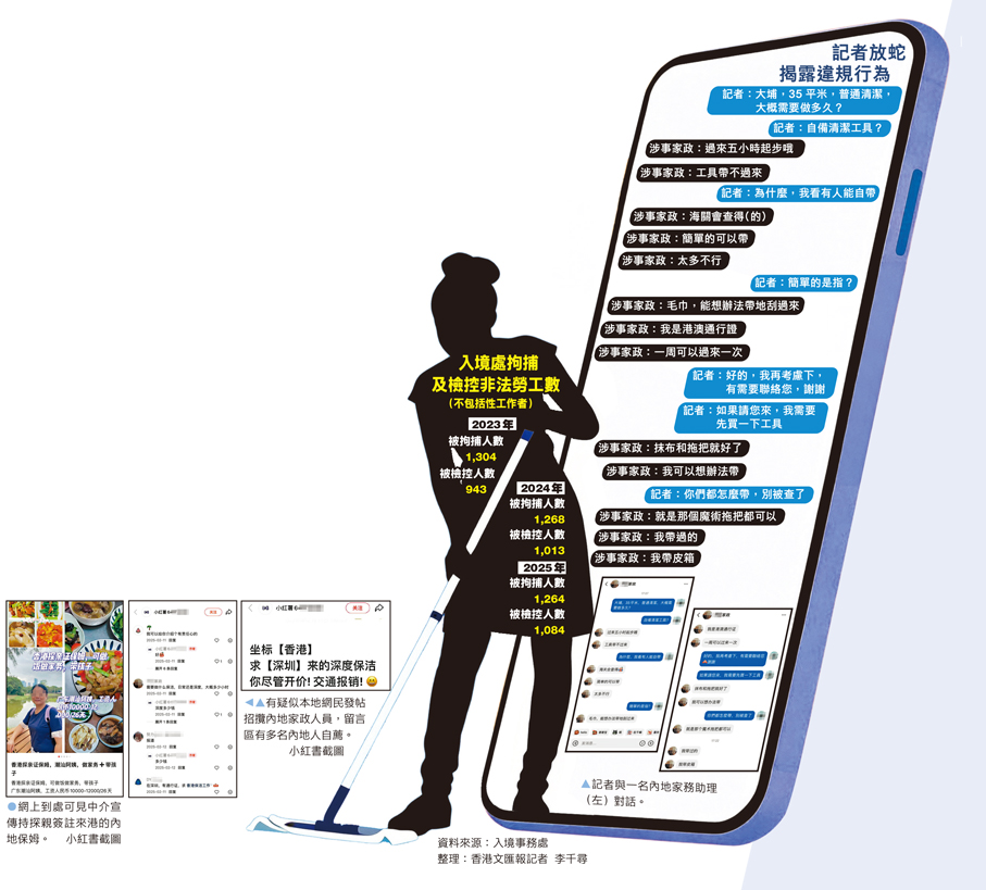 不少家庭都為新年大掃除做準備,家務助理需求因此上升。港九勞工社團聯會與家庭服務從業員協會(家服工會)昨日公布一項調查,揭示業界黑工問題嚴重,近九成半受訪者直指社交媒體的疑似非法勞工招聘廣告,影響本地勞工的就業機會與薪酬水平。香港文匯報記者昨日搜查小紅書、微信群等多個社交平台,輕易聯絡到兩名承認持往來港澳通行證及旅遊簽註、專門赴港提供清潔服務的內地居民,她們每小時收費報價130港元及150港元,更有人持多次往返簽註,經常連續來港打工。記者並發現,她們為避開執法部門懷疑,常以伸縮拖把等簡易工具裝入行李箱,低調入境。另有部分家政中介會透過平台發布廣告,公然宣傳持探親簽註的內地居民長期駐港做保姆工作,月薪可達逾萬元。入境處表示,密切關注與非法勞工活動相關的罪案趨勢,與相關執法部門保持緊密聯繫,適時採取執法行動。