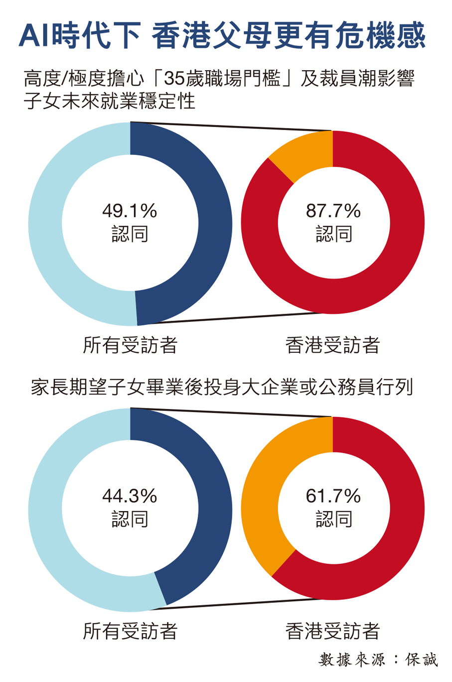 值得留意的是,香港父母對職場現實變化的焦慮尤為強烈。整體受訪父母中,近五成人擔心「35歲職場門檻」會影響子女未來職業的穩定性,而該比例在香港更高達近九成;44.3%受訪父母希望孩子完成學士或更高學歷後,能夠投身大企業或公務員行列,這一比例在香港父母中高達61.7%,表明港人對「安穩生涯」或「鐵飯碗」的追求更為明顯。