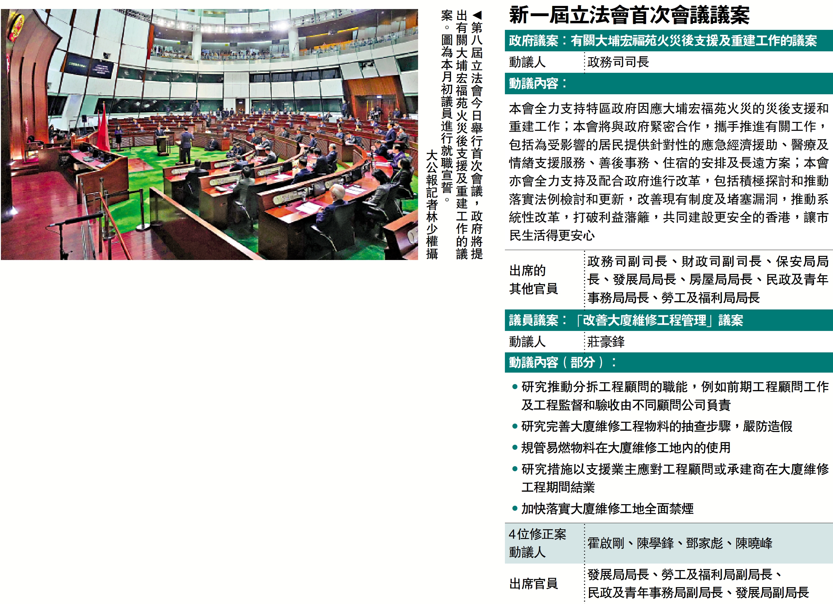 今日是本屆立法會會期首次會議,政府提出首份議案。該份由政務司司長動議的政府議案提出:本會全力支持特區政府因應大埔宏福苑火災的災後支援和重建工作;本會將與政府緊密合作,攜手推進有關工作,包括為受影響的居民提供針對性的應急經濟援助、醫療及情緒支援服務、善後事務、住宿的安排及長遠方案;本會亦會全力支持及配合政府進行改革,包括積極探討和推動落實法例檢討和更新,改善現有制度及堵塞漏洞,推動系統性改革,打破利益藩籬,共同建設更安全的香港,讓市民生活得更安心。