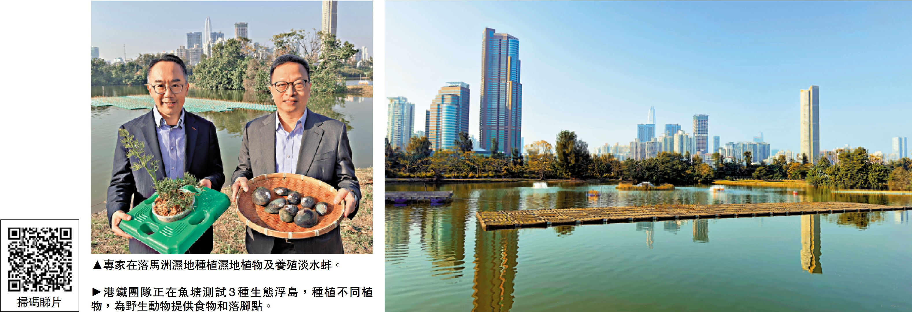 港鐵公司自2007年起管理落馬洲濕地,透過與環境專業人士合作,豐富濕地生物多樣性,現已錄得超過280種鳥類出沒,18年間增加約25%,亦成為黑臉琵鷺、禾花雀等瀕危和臨危鳥類的棲息地。為進一步提升濕地生態,港鐵和香港大學合作,今年在濕地推行為期一年的測試項目,建立「濕地植物及魚苗培育基地」、設置生態浮島和養殖淡水蚌,通過養殖不同營養階的水產及植物改善生境。\大公報記者 黃佩琳(文) 蔡文豪(圖、視頻)