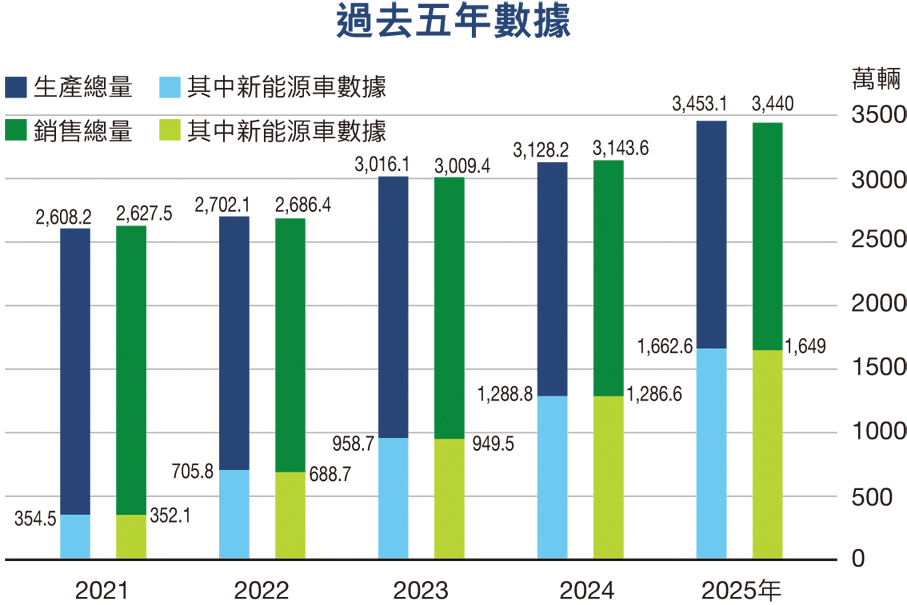 2025年,中國汽車行業繼續展現出強大的發展韌性和活力,多項經濟指標再創新高。中國汽車工業協會(簡稱「中汽協」)14日在京發布的數據顯示,2025年,全國汽車產銷量分別為3,453.1萬輛和3,440萬輛,同比分別增長10.4%和9.4%,產銷量再創歷史新高,連續17年穩居全球第一。值得注意的是,新能源汽車全年產銷量超1,600萬輛,在國內新車銷量佔比超50%,成為汽車市場主導力量。在對外貿易方面,汽車出口超700萬輛,新能源汽車出口261.5萬輛,同比增長1倍。據預測,新能源汽車銷量在2026年有望達到1,900萬輛,保持15%以上的增速。