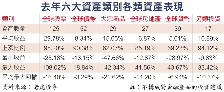 徐楊回顧2025年全球資產表現時指出,在統計的289個全球資產指數中,多數資產錄得上漲(詳見另表)。其中股票類資產表現突出,全球125個股票指數中約95%上漲,大宗商品亦有逾60%實現正收益。中國原材料行業指數漲幅領先,白銀、鉑金、銅、鋁等工業金屬價格走勢強勁。