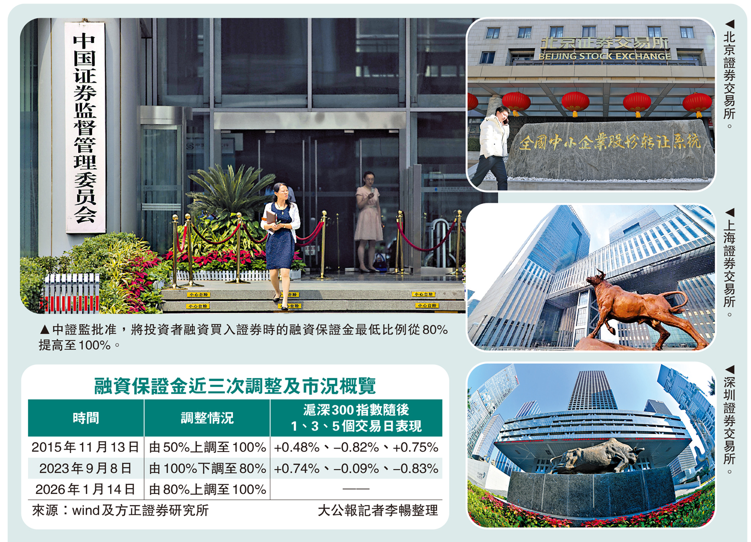 A股連日破頂,監管層出手為市場降溫。滬深北交易所14日發布通知,經中證監批准,調整融資保證金比例,將投資者融資買入證券時的融資保證金最低比例從80%提高至100%,為時隔十年再度將融資保證金調整至100%。業內分析認為,兩融餘額進一步快速增加,槓桿資金快速膨脹,監管此舉是為了防範市場過熱風險,短期個別板塊或會因為槓桿資金減少而面臨調整壓力。但長遠將引導市場向長牛、慢牛格局發展。\大公報記者 李 暢