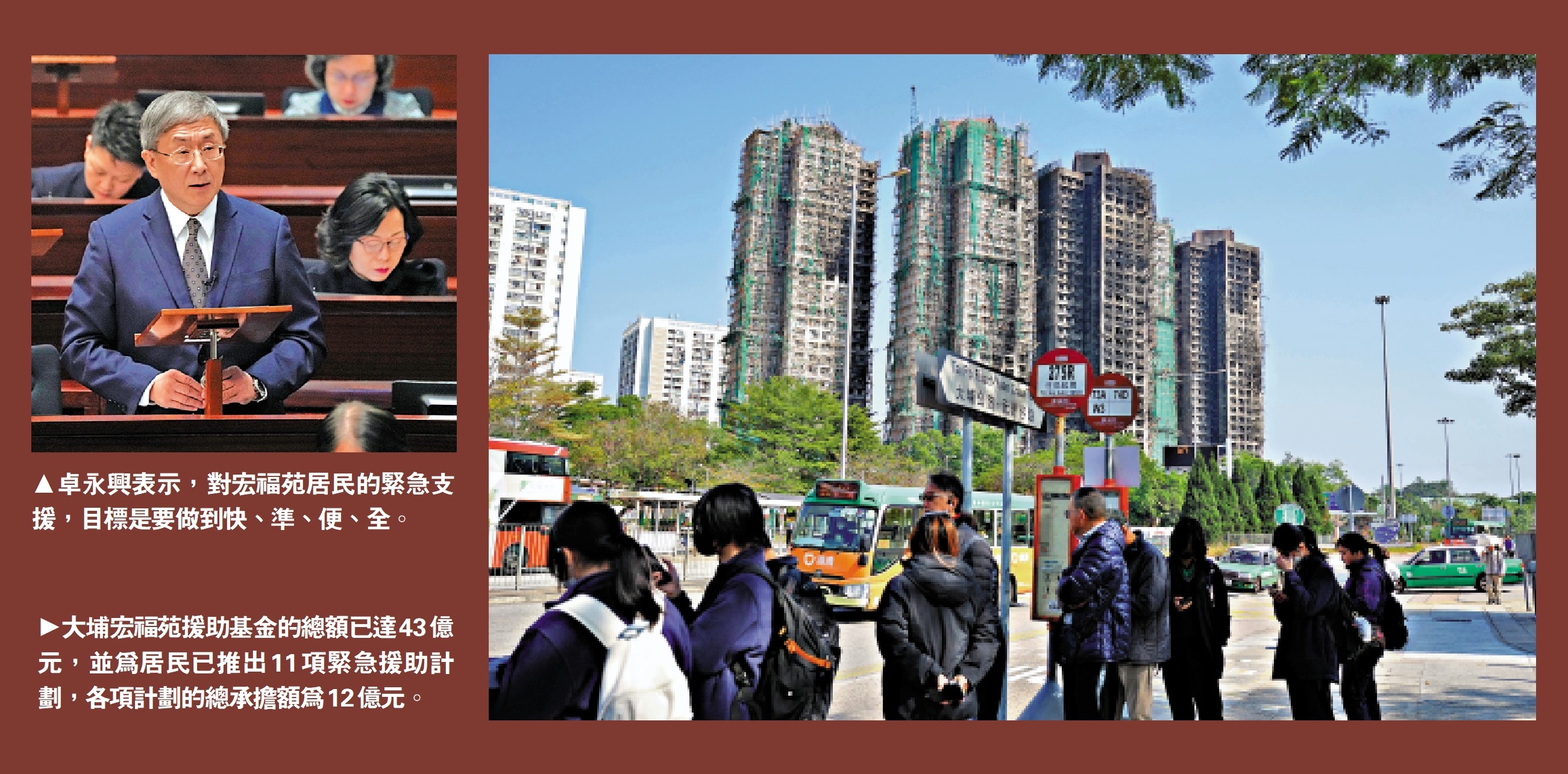 新一屆立法會昨日召開首次大會。政務司副司長、「緊急支援及募捐工作組」組長卓永興在大會發言時指出,工作組成立「大埔宏福苑援助基金」,在財政上為災民提供支援,收集各界的捐獻。卓永興介紹,截至本月13日,「大埔宏福苑援助基金」總額已達43億元,並已推出11項緊急援助計劃,各項計劃的總承擔額為12億元。「援助基金」的所有款項,都會全數用於協助居民應付喪失家園面對的困境,提供緊急和中長期的支援,協助他們回歸正常生活、重建家園。他強調,相關政策局及部門會協助落實基金的項目,但有關的開支都會各自承擔,不會向「基金」尋求回撥。\大公報記者 陸九如