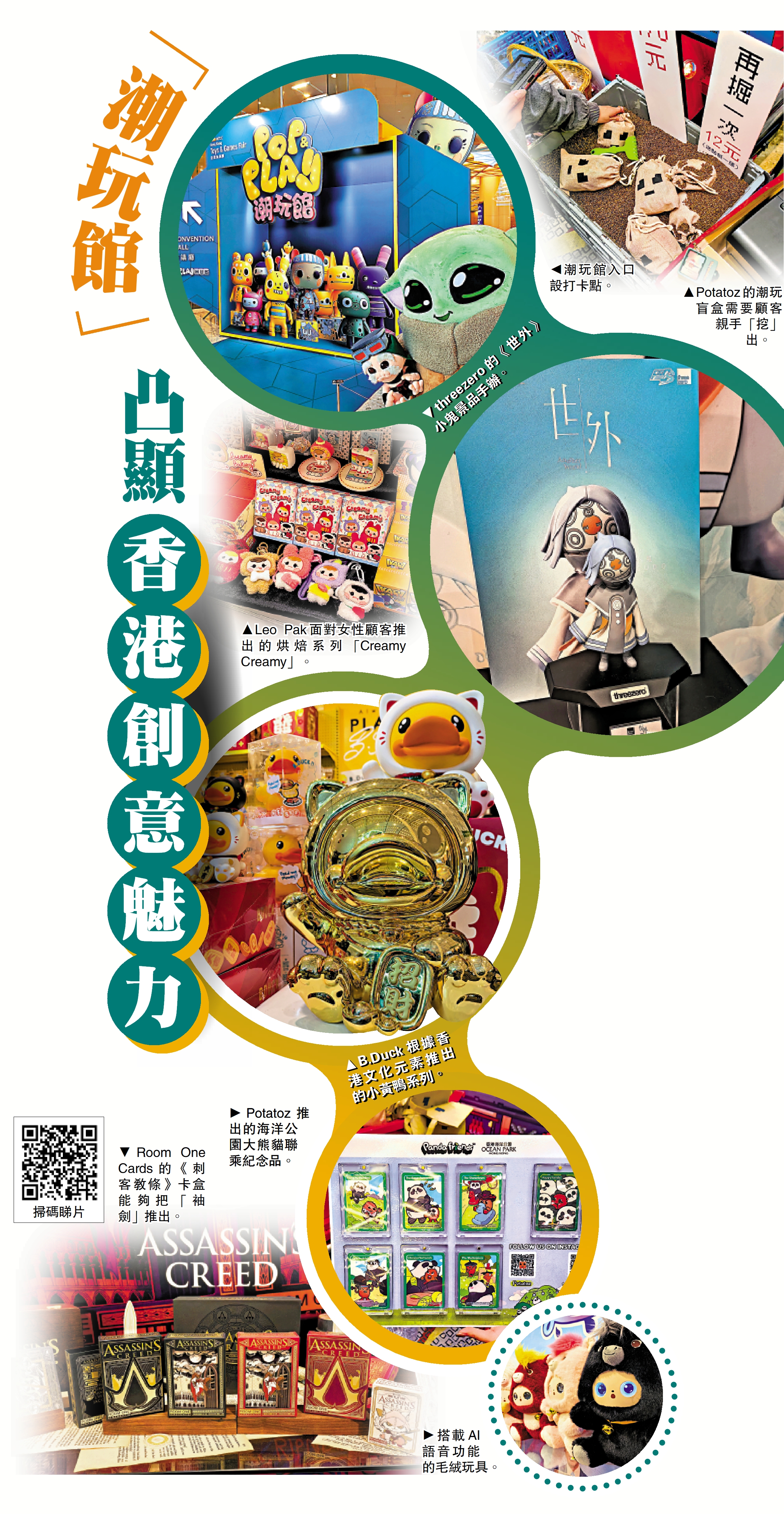 本屆潮玩館雲集海內外約150個IP。除了潮玩擺件外,現場亦有參展商帶來搭載語音功能的AI毛絨玩具、帶有香港文化元素的聯乘IP產品等,為公眾首度集中展現熱門IP潮玩的魅力。