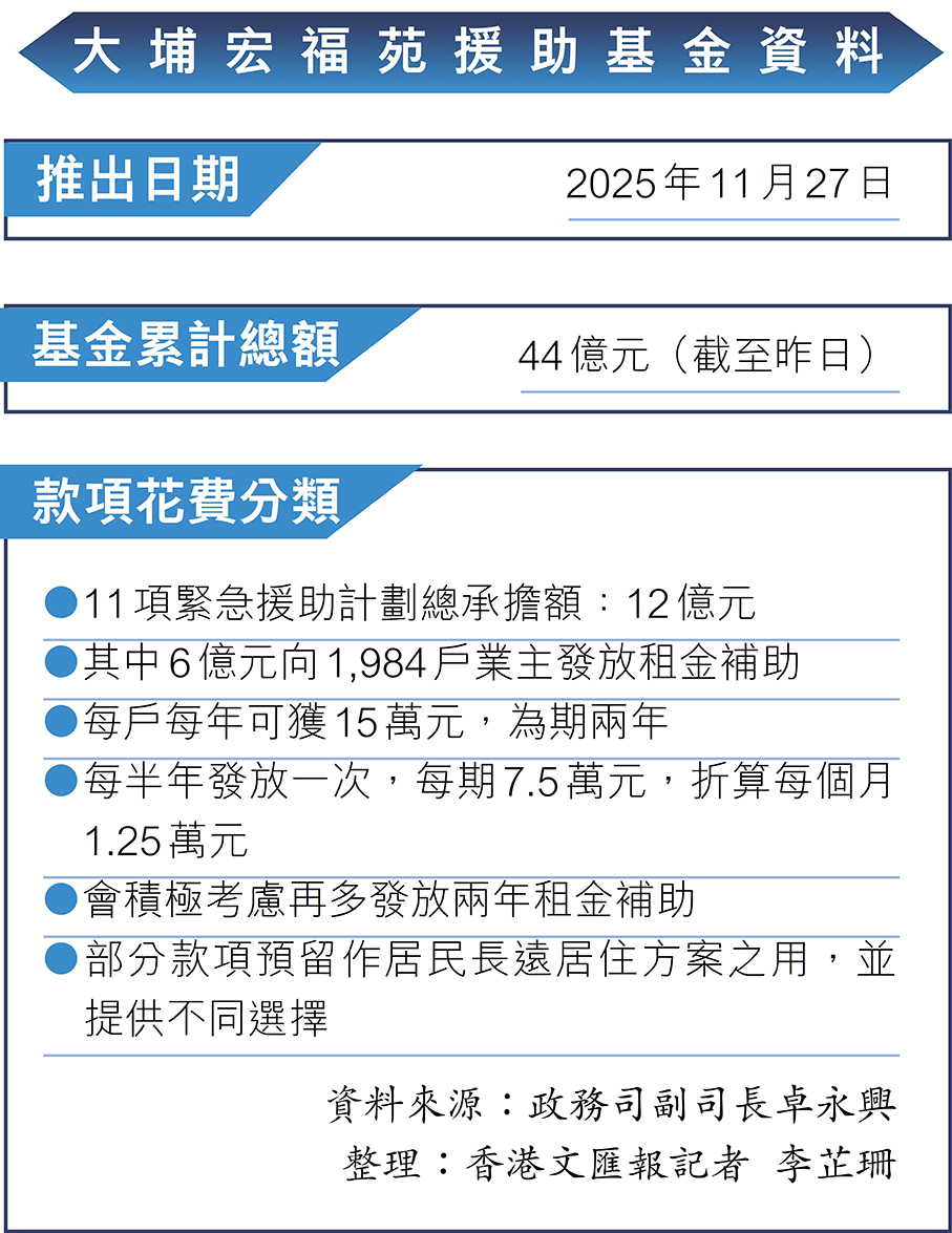 香港文匯報訊(記者 李芷珊)大埔宏福苑早前發生嚴重火災,行政長官李家超於事故翌日迅速宣布成立3個相關工作組,其中緊急支援及募捐工作組由特區政府政務司副司長卓永興擔任組長,並設立大埔宏福苑援助基金,旨在為受災居民提供急切支援。卓永興昨日接受香港文匯報記者訪問時表示,截至昨日基金總額累積44億元,較前一日增加1億元,當中3億元為政府撥出的起動基金,其餘41億元來自社會籌集,政府將以「快、準、便、全」原則為受影響居民提供緊急支援。