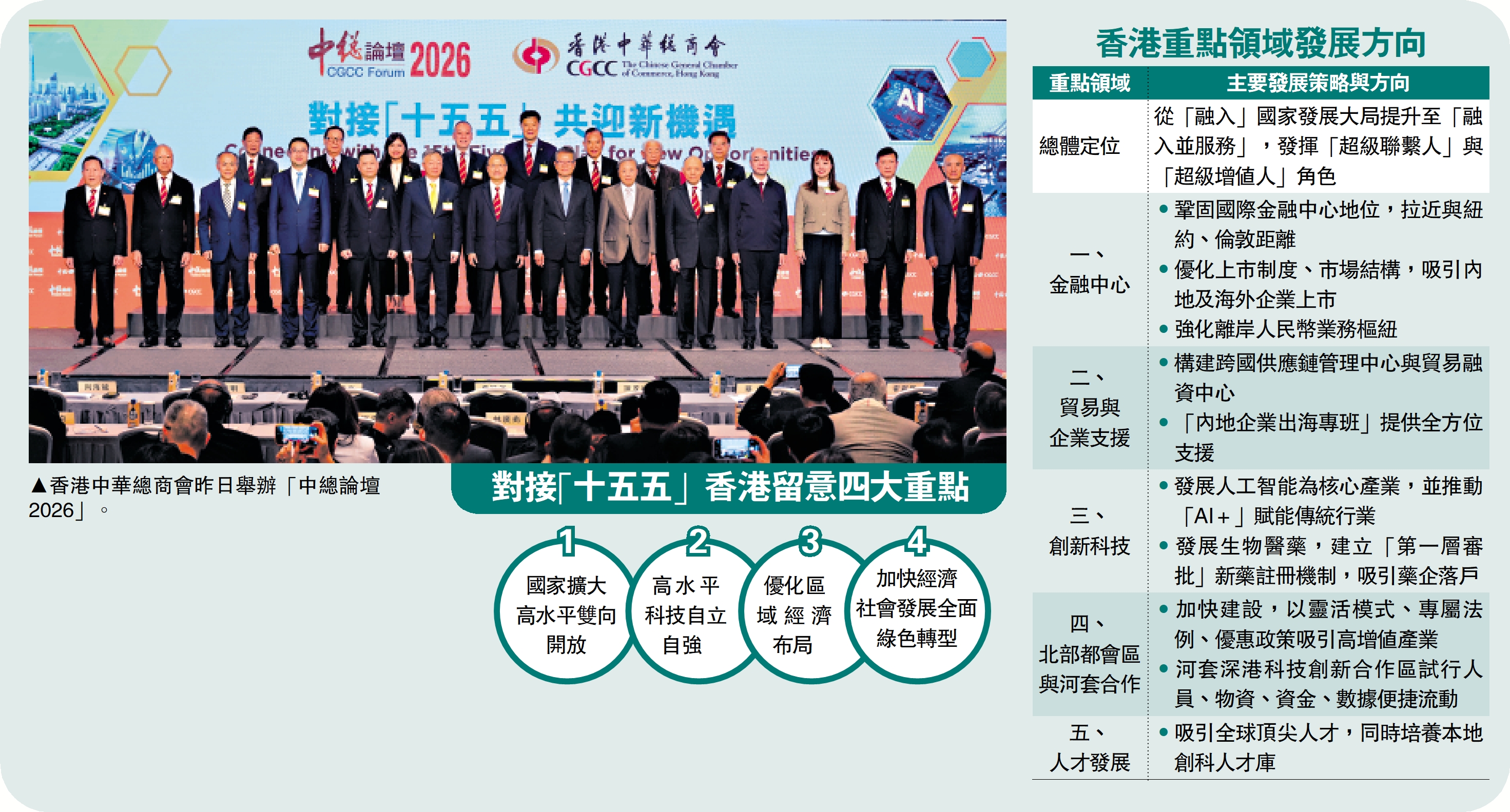 香港中華總商會主辦的「中總論壇2026」昨日舉行,論壇以「對接『十五五』共贏新機遇」為主題,財政司司長陳茂波發表主旨演講,分析新一年香港經濟形勢,並對本港經濟作「審慎樂觀」展望。他指出,今年是國家「十五五」規劃的開局之年,香港值得特別留意四個重點,包括國家擴大高水平雙向開放、高水平科技自立自強、優化區域經濟布局以及加快經濟社會發展全面綠色轉型。/大公報記者 李樂兒(文)、何嘉駿(圖)
