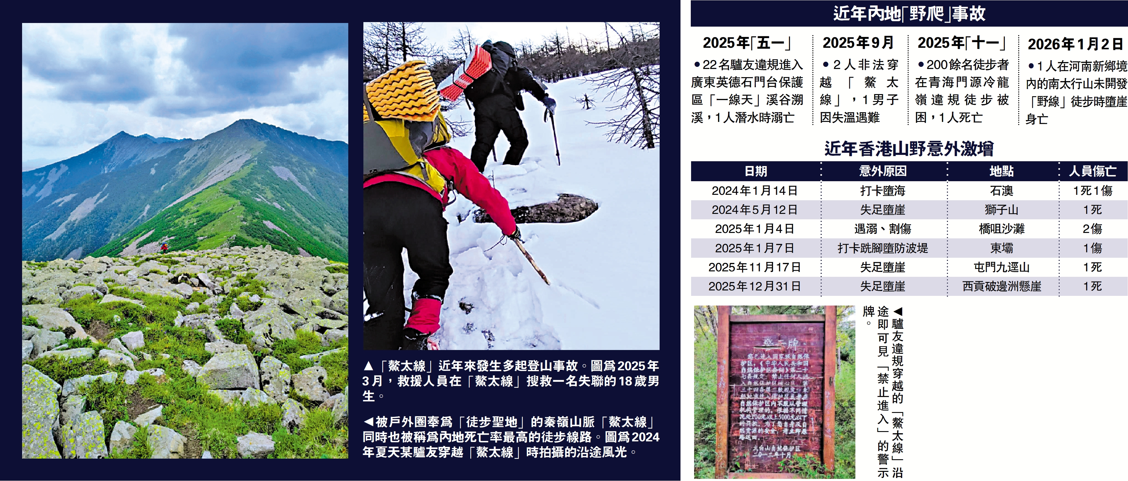 據中國探險協會發布的《2024年度中國戶外探險事故報告》顯示,2024年全國共發生戶外探險事故335起,死亡84人,失蹤11人,其中徒步項目佔總事故涉及人數的73%。1月9日,國家體育總局登山中心發出緊急通知,嚴禁一切形式的違規徒步穿越等活動,加強網紅路線監管。\大公報記者 李陽波