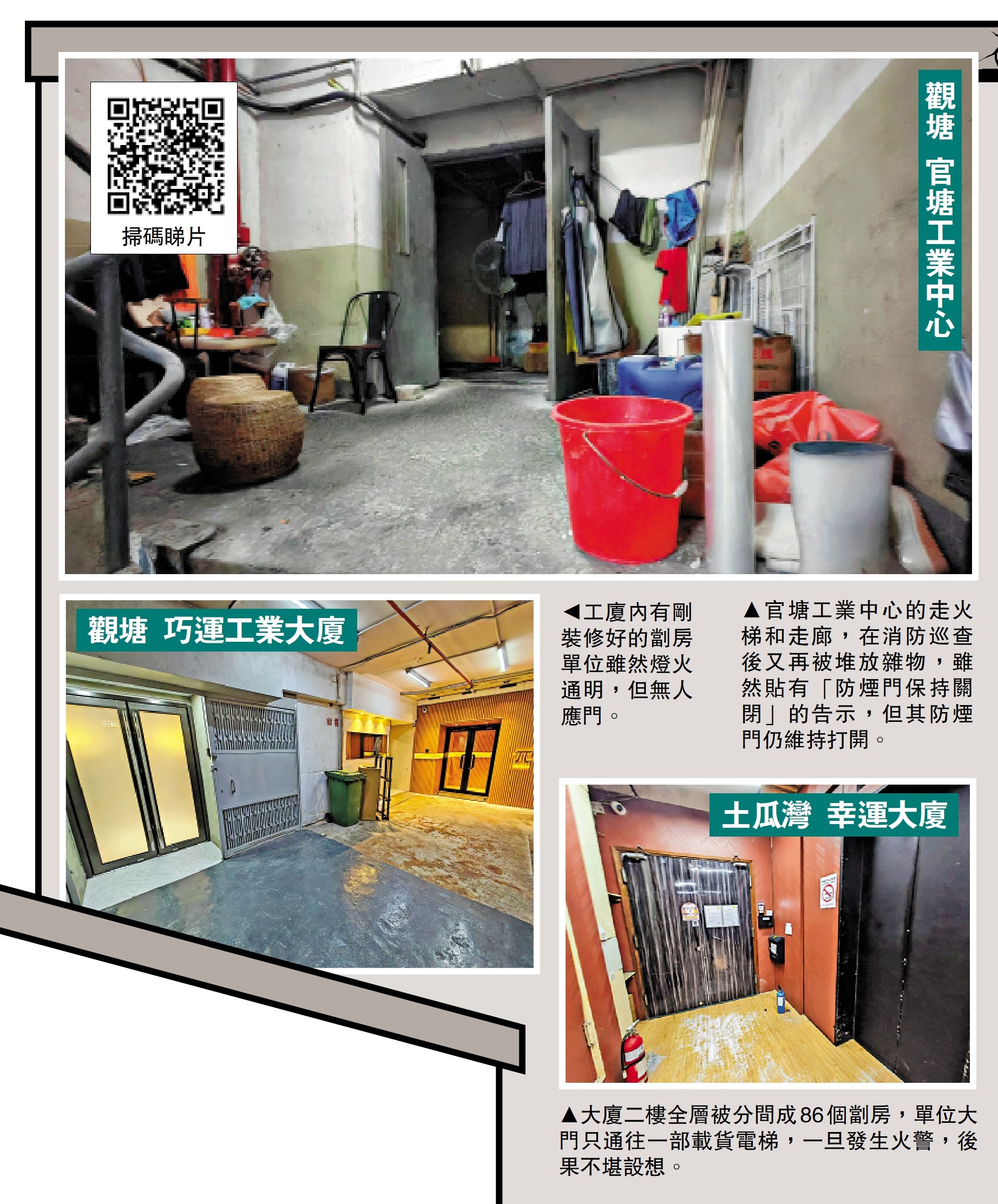《大公報》早前推出一連五篇「工廈亂象」系列報道,揭示紅磡、土瓜灣、新蒲崗、觀塘、荃灣等多區的工廠大廈,有不同的違規問題,當中在觀塘駿業街、偉業街的多幢工廈,有經紀極力推銷工廈劏房,推銷過程中提到可以在單位過夜居住,涉嫌違反《建築物條例》及地契條款,大公報記者當日發現,最誇張的一層被劏成數十個單位,多間房門外放置鞋架,相信單位內有人入住,另工廈內的滅火筒已過期。