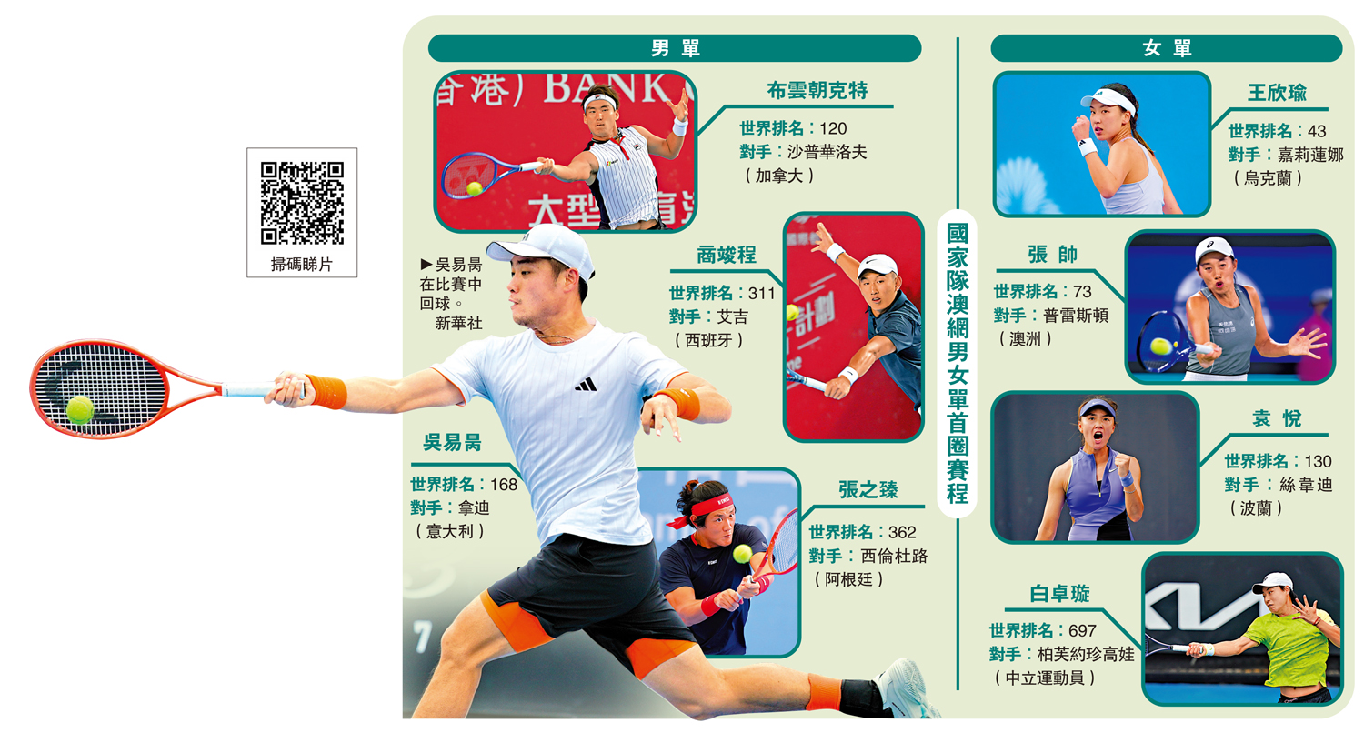 吳易昺正賽首圈將對陣意大利球手、世界排名第108位的拿迪。另一位國家隊男將張之臻,將出戰世界排名第20位的阿根廷球手西倫杜路,至於商竣程就會遇上西班牙球手、世界排名90位的艾吉,而布雲朝克特則會與加拿大球手、世界排名第23位的沙普華洛夫爭奪晉級次圈資格。
