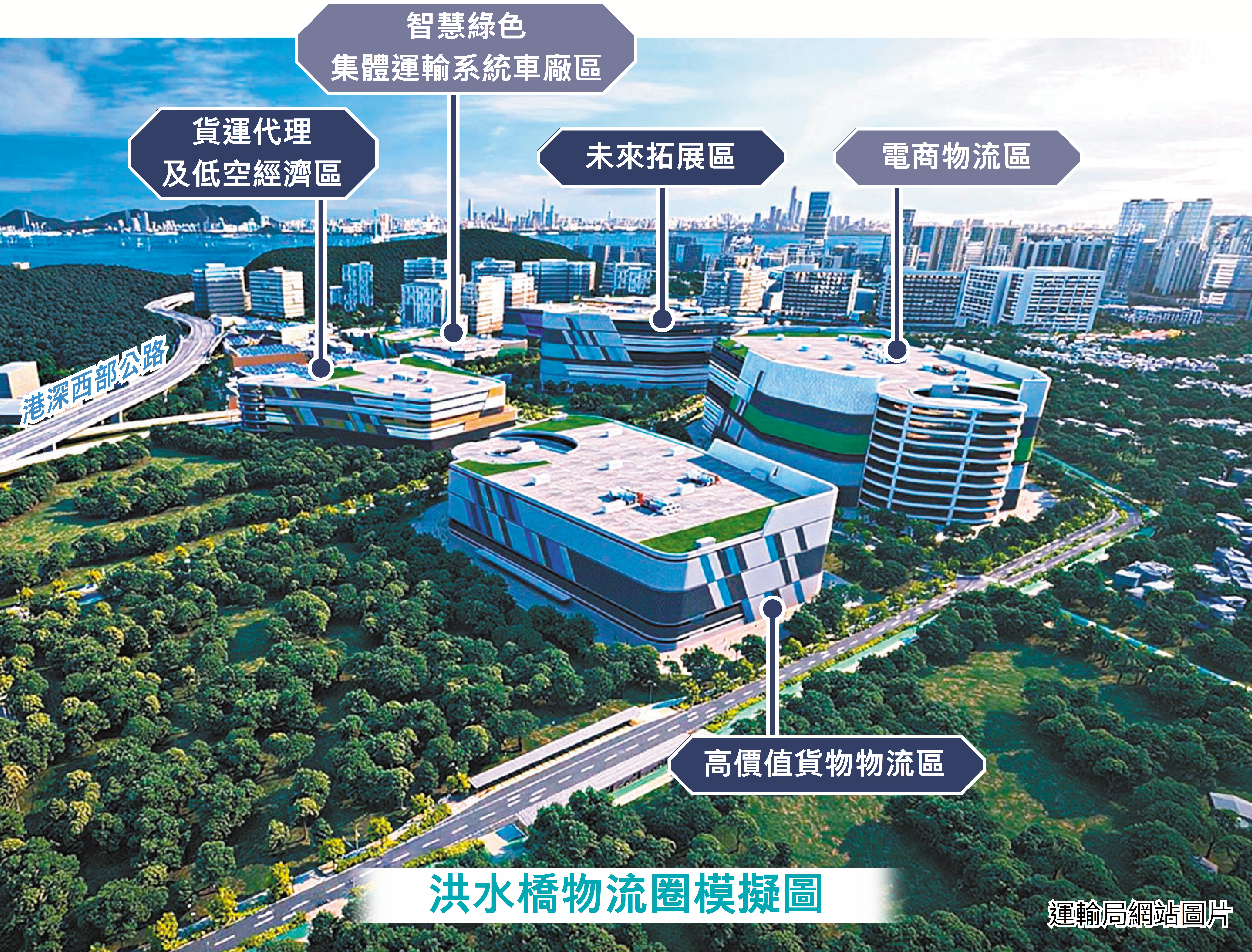 發言人表示,物流圈西部會預留約4.2公頃土地,作為智慧綠色集體運輸系統車廠,系統日後將連接物流圈、洪水橋/厦村新發展區市中心及鐵路網,提升區內交通效率,預計2027年投入運作;位於北部的未來拓展區約7.4公頃,由於發展時間相對較遲,將作長遠規劃使用,根據物流業發展趨勢考慮發展電商物流或貨運代理業務,預期2031至2032年就緒。