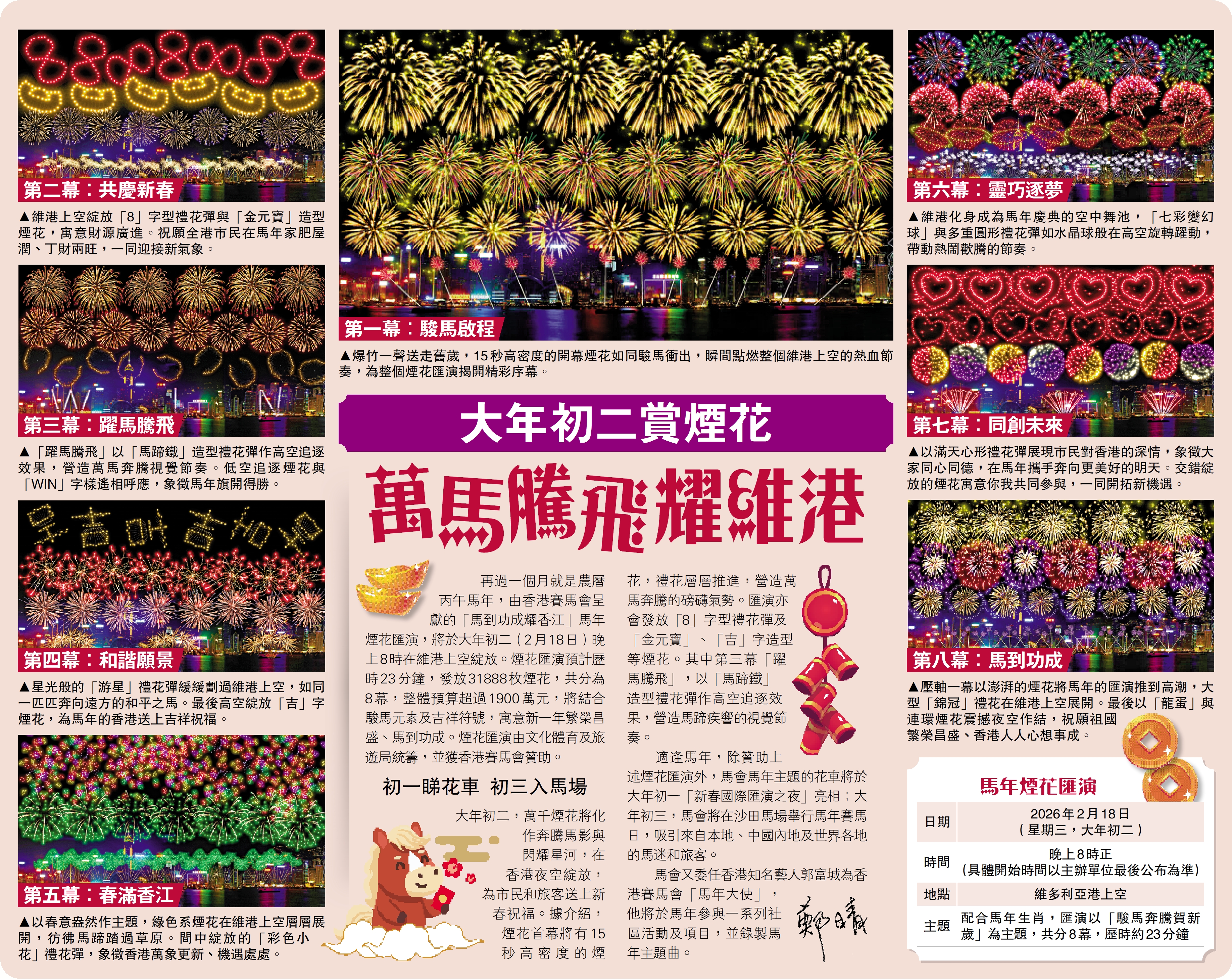再過一個月就是農曆丙午馬年,由香港賽馬會呈獻的「馬到功成耀香江」馬年煙花匯演,將於大年初二(2月18日)晚上8時在維港上空綻放。煙花匯演預計歷時23分鐘,發放31888枚煙花,共分為8幕,整體預算超過1900萬元,將結合駿馬元素及吉祥符號,寓意新一年繁榮昌盛、馬到功成。煙花匯演由文化體育及旅遊局統籌,並獲香港賽馬會贊助。