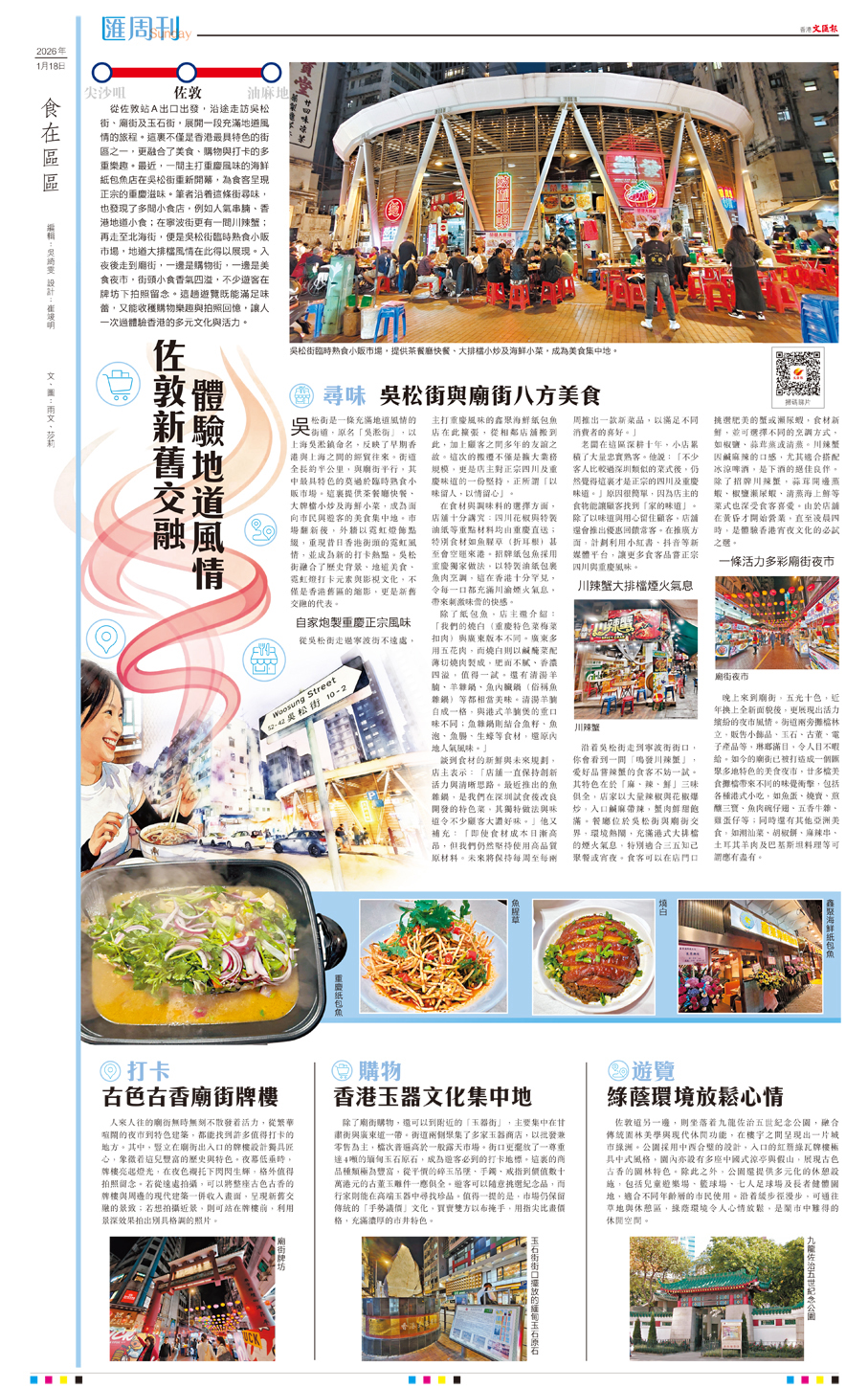 從佐敦站A出口出發,沿途走訪吳松街、廟街及玉石街,展開一段充滿地道風情的旅程。這裏不僅是香港最具特色的街區之一,更融合了美食、購物與打卡的多重樂趣。最近,一間主打重慶風味的海鮮紙包魚店在吳松街重新開幕,為食客呈現正宗的重慶滋味。筆者沿着這條街尋味,也發現了多間小食店,例如人氣串腩、香港地道小食;在寧波街更有一間川辣蟹;再走至北海街,便是吳松街臨時熟食小販市場,地道大排檔風情在此得以展現。入夜後走到廟街,一邊是購物街,一邊是美食夜市,街頭小食香氣四溢,不少遊客在牌坊下拍照留念。這趟遊覽既能滿足味蕾,又能收穫購物樂趣與拍照回憶,讓人一次過體驗香港的多元文化與活力。