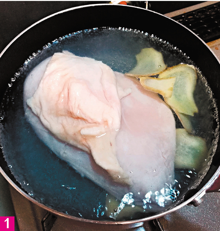1. 小鍋內注水約700毫升、加入薑片、大火燒至沸騰後加入雞胸肉,再沸騰後轉中小火,煮15分鐘;