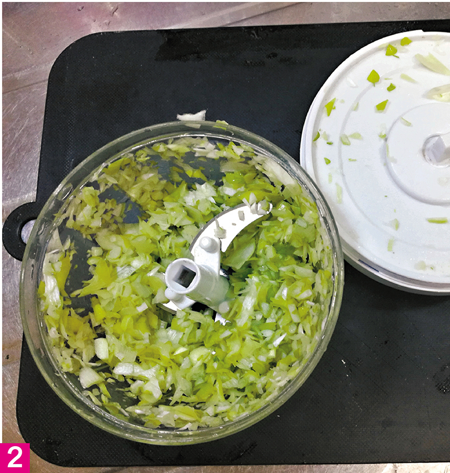 2. 將大葱洗淨、切成小段,放入研磨器搗碎,取出大葱放入耐熱容器內備用;