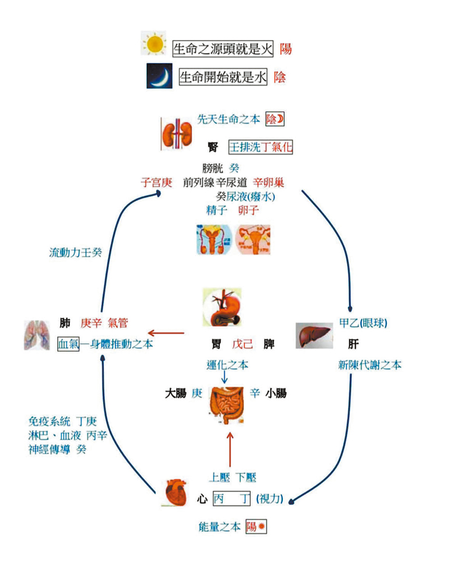 腎臟命門之火壬丁化甲乙木,肝臟受到滋潤,生發功能良好,就能生丙丁火,丙丁火又能支持整個戊己土的消化系統,消化系統自然能夠生扶肺庚金及辛金功能的推動力。氣是血之帥,而血是氣之母。氣血足,流向身體所有的部位,五臟六腑得到滋養,五行生態系統健康,自然百病不侵,身體健康。反之,五行生態系統受到破壞,就百病叢生了。