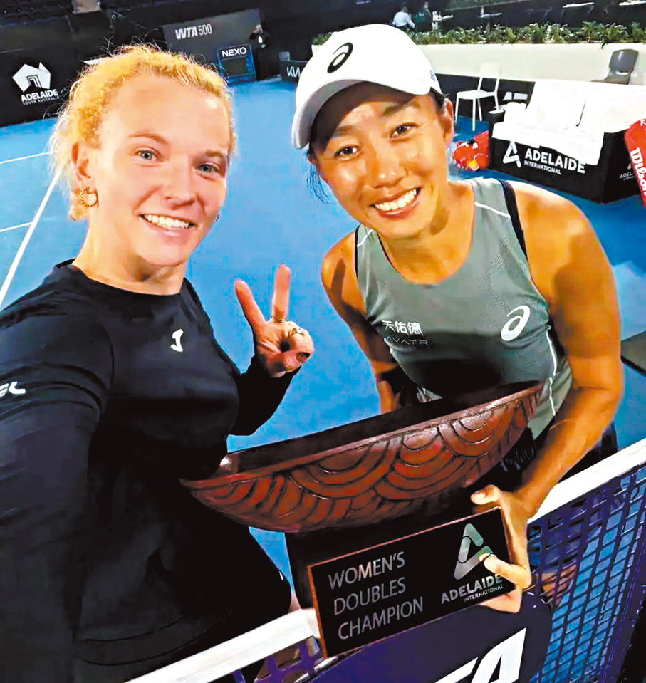 昨日(17日)女子網球選手協會(WTA)500阿德萊德站雙打決賽,中國36歲老將張帥(上圖右)夥拍捷克名將仙妮雅高娃以2:0擊敗烏克蘭球手姬捷諾克和美國球手克拉夫奇克的組合,奪得冠軍。 這是張帥職業生涯的第16個巡迴賽雙打冠軍,她賽後喜道:「我們拍檔過很多次,也很享受並肩作戰。網球讓每個人都開心、健康,這是最重要的。」 ●網上圖片