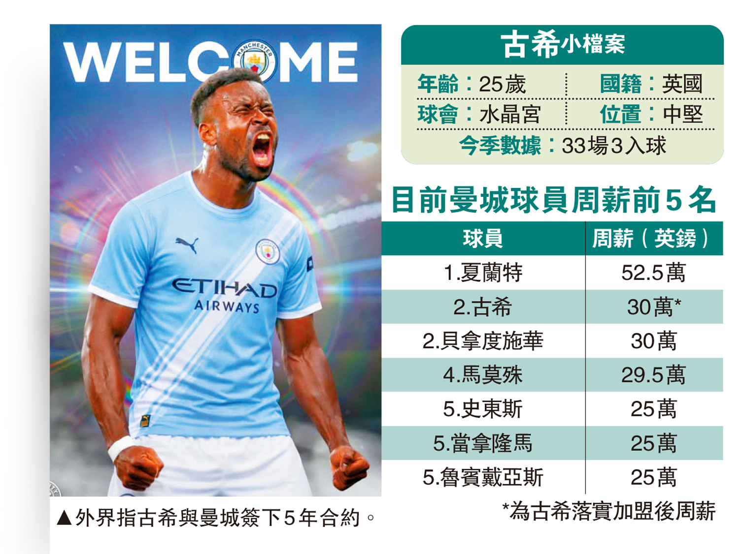 【大公報訊】英格蘭中堅馬克古希爭奪戰接近落幕,英超勁旅曼城以「超抵價」2000萬英鎊(約2億港元)轉會費向水晶宮提出收購,後者接納報價,古希即將接受體測,如無意外他將與曼城簽下5年合約,並獲得30萬英鎊(約300萬港元),使他與貝拿度施華並列隊內第二高薪球員,並僅次於射手艾寧夏蘭特。