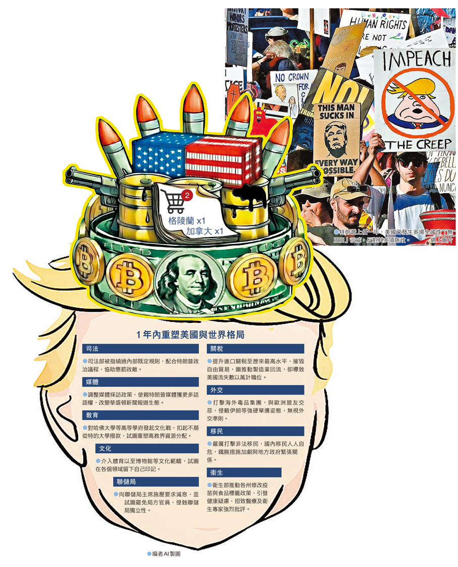 香港文匯報訊 美國總統特朗普重返白宮,到明日(1月20日)將滿一年,過去一年時間,特朗普極力奉行「美國優先」政策,史無前例地打破二戰後的全球秩序。路透社等媒體指出,特朗普實則是以維護美國國家安全和經濟利益為名,行單邊主義、掠奪資源、粗暴干涉他國內政之實。美國在委內瑞拉、格陵蘭、加沙等地的行動,都被廣泛批評為新帝國主義,衝擊現行國際秩序。