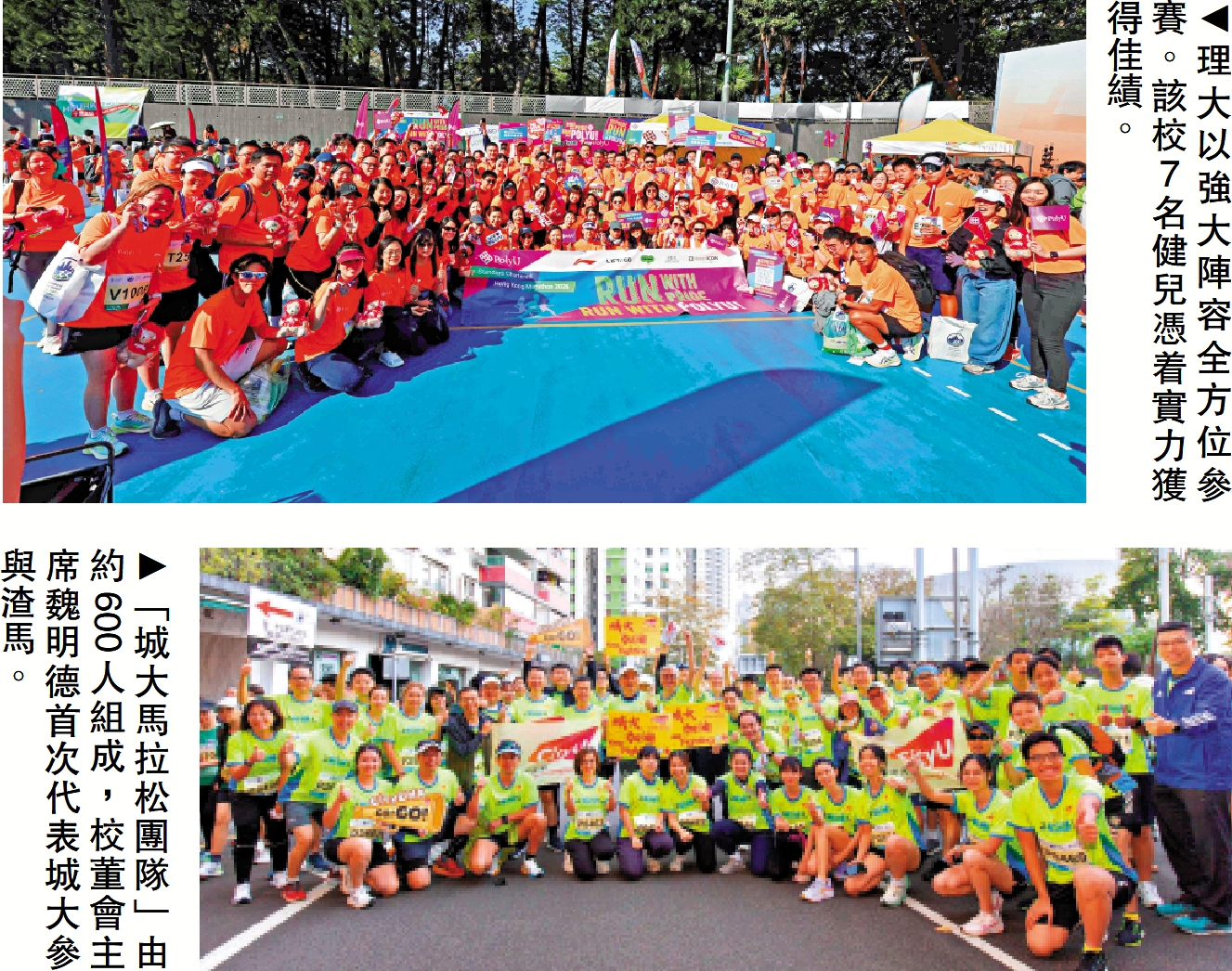 香港城市大學約600人組成「城大馬拉松團隊」,校董會主席魏明德首次代表城大參與渣打香港馬拉松,他表示,很高興能與城大社群一同參賽,體驗團隊精神與歸屬感。