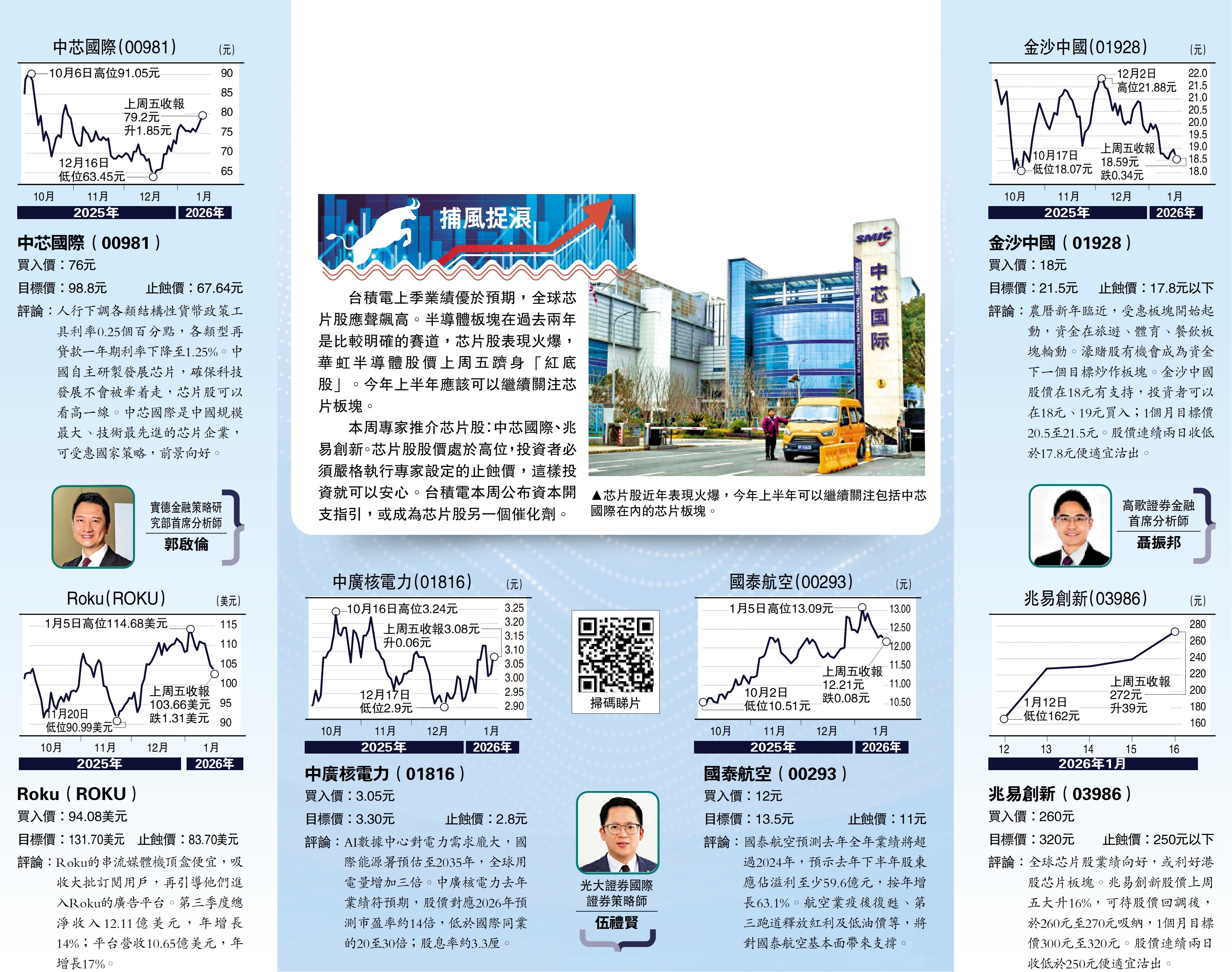 本周專家推介芯片股:中芯國際、兆易創新。芯片股股價處於高位,投資者必須嚴格執行專家設定的止蝕價,這樣投資就可以安心。台積電本周公布資本開支指引,或成為芯片股另一個催化劑。