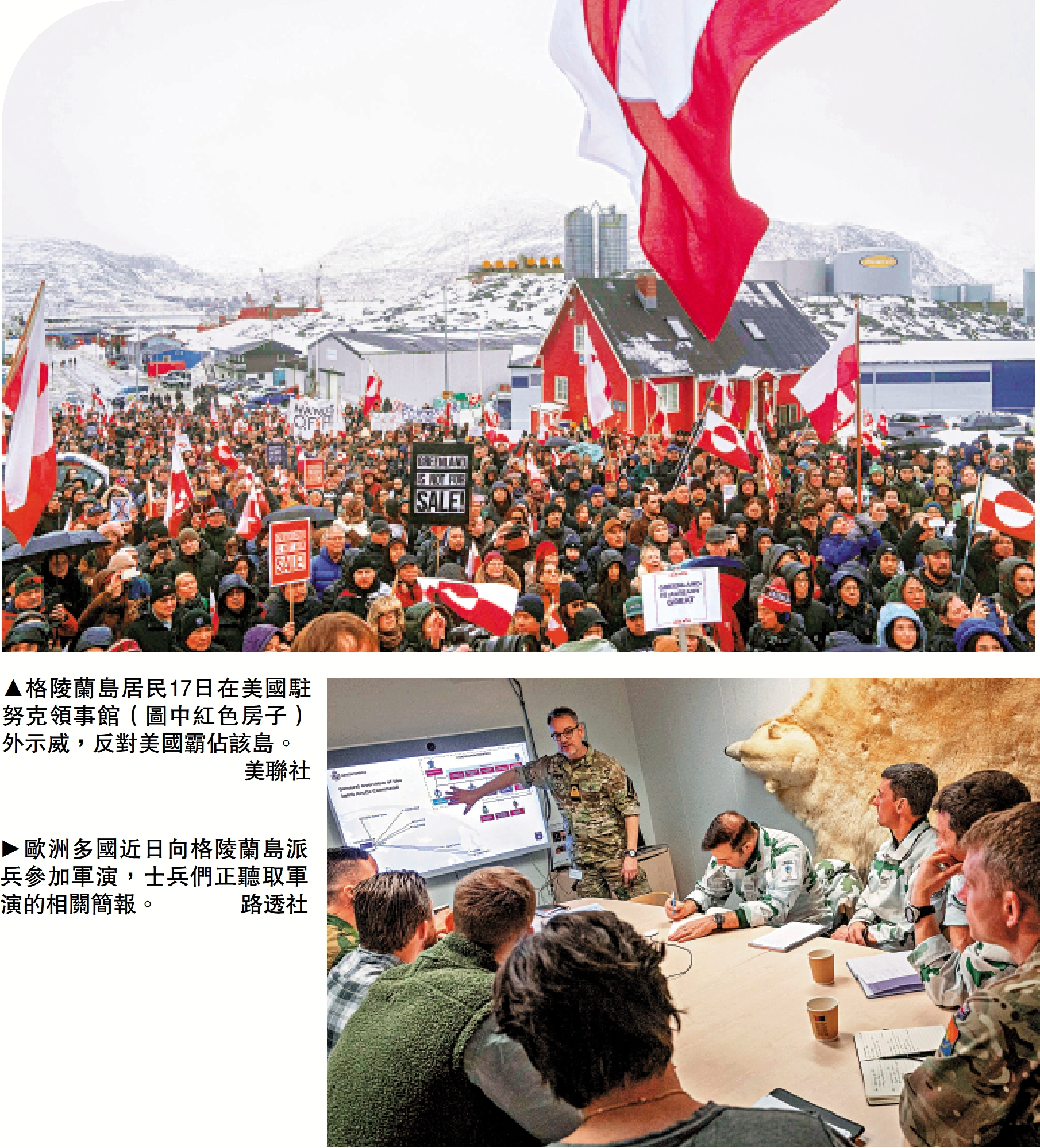 17日,丹麥本土與格陵蘭島多地舉行示威遊行,抗議美國企圖強佔格陵蘭島。中午12時許,上萬名示威者從哥本哈根市政廳廣場出發,沿街前往約兩公里外的美國駐丹麥大使館。遊行隊伍抵達美國駐丹麥大使館外後,人群不斷聚集,「絕不出售格陵蘭島」「美國人請走開」等標語在冬日陰沉的天空下格外醒目。丹麥議會議員揚·約恩森感嘆,他從沒想過會站在美國使館門前示威,「我過去是親美的,但現在不是了」。格陵蘭島的示威者則聚集在美國駐努克領事館外。他們表示,特朗普有關「獲得格陵蘭島」的言論令人不安。格陵蘭島自治政府總理尼爾森也出現在示威現場,揮舞旗幟抗議美國「奪島」企圖。