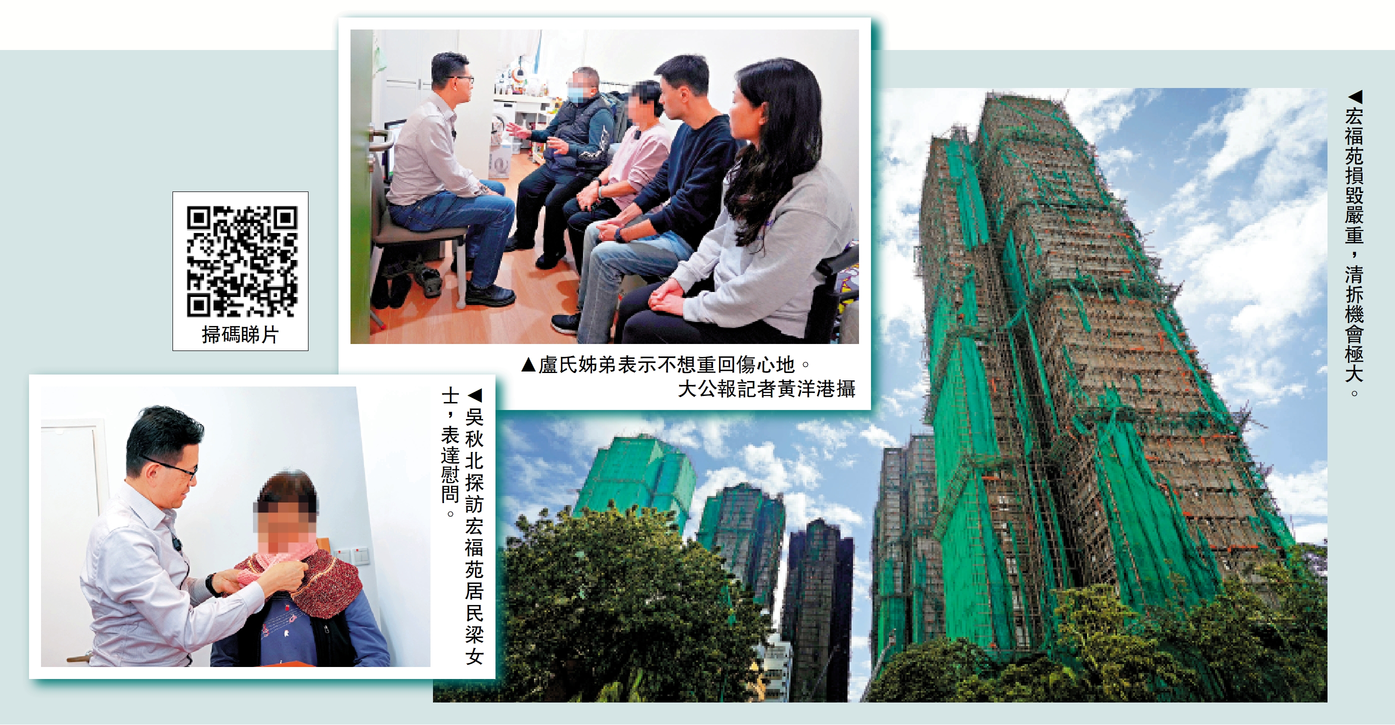 工聯會會長吳秋北近日到場探訪居民,指受災居民雖然力求自強,但臨時安置終屬權宜之計,政府需以多元方案加快推進長遠安置工作,尊重每個家庭的實際需要,避免「一刀切」。他強調,樓換樓、政府回購等方法更為高效,原址重建屋苑再進行安置,並不是理智的做法。\大公報記者 李慧妍