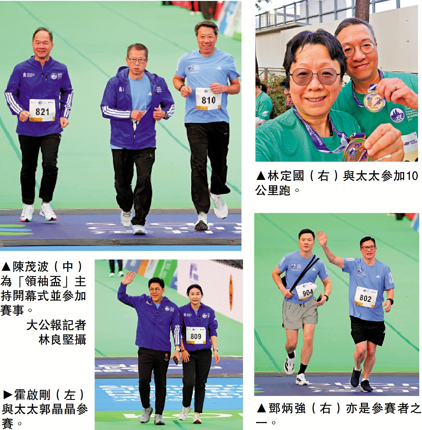 【大公報訊】記者易曉彤報道:18日,多名政商界人士參加渣打香港馬拉松,財政司司長陳茂波為「領袖盃」主持開幕式並參加賽事。「領袖盃」賽程兩公里,由灣仔運動場起步跑到維園終點,參加賽事的政商領袖及各界名人還包括保安局局長鄧炳強、醫務衞生局局長盧寵茂、蘭桂坊集團主席盛智文、廠商會會長盧金榮等。立法會議員霍啟剛與太太郭晶晶亦一同現身維園終點。