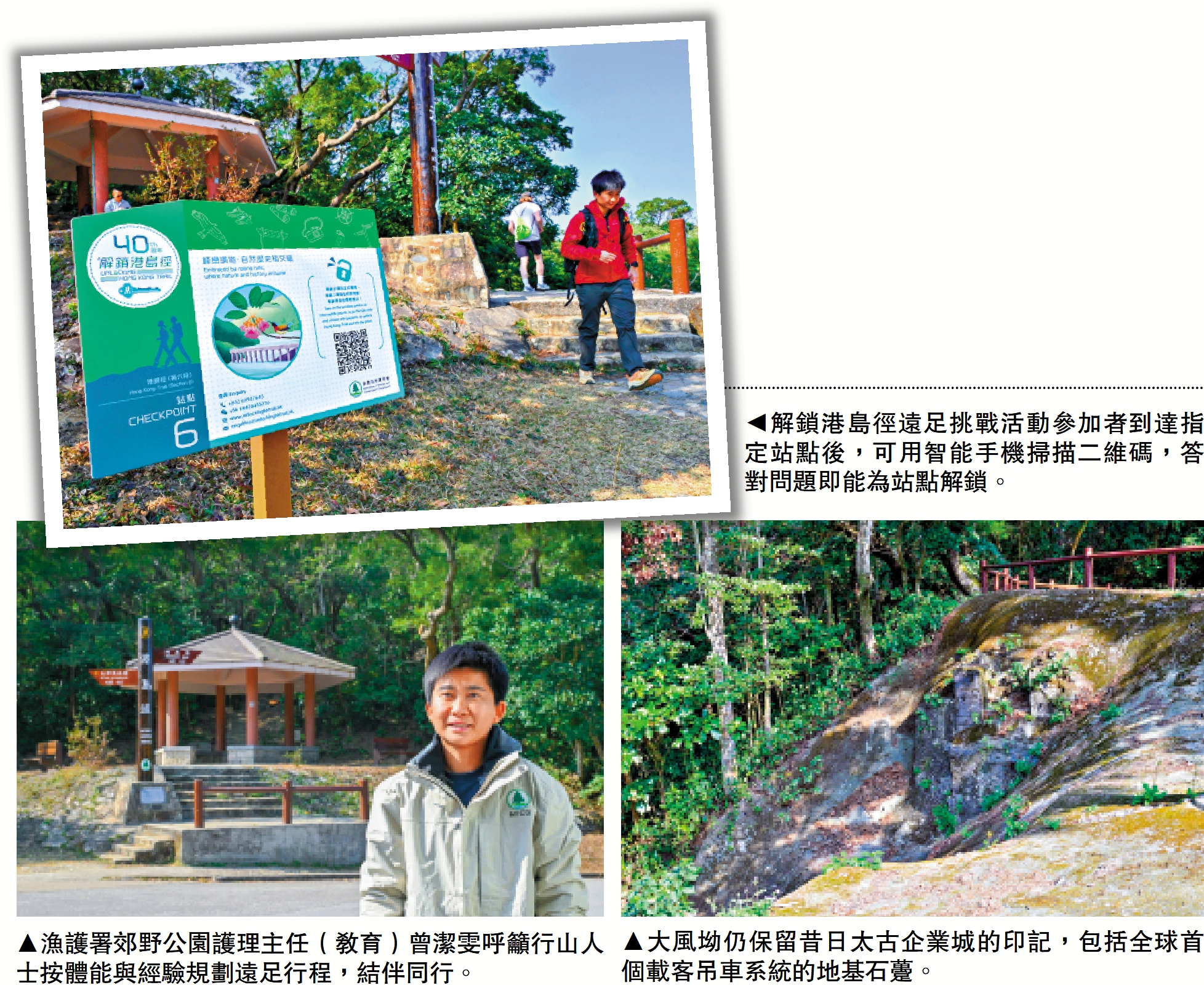 另外,為紀念港島徑啟用40年,漁護署推出「解鎖港島徑」遠足挑戰活動,於全徑八段各設一個站點,並為每站設計以地標和生物多樣性為主題的電子獎章,讓市民打卡「尋寶」。