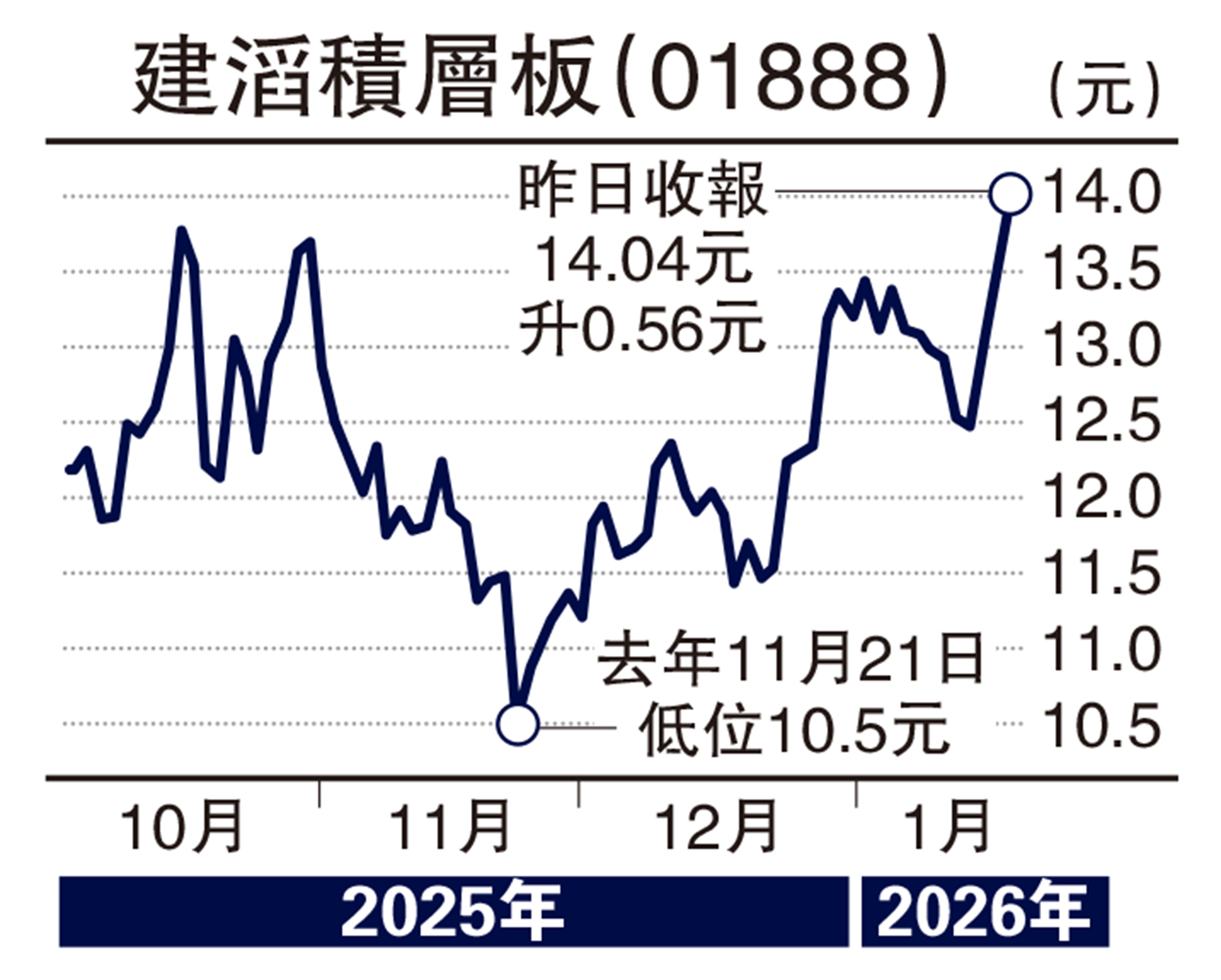 建滔積層板(01888)昨日最多升5.3%,見14.19元的52周新高,最終升4.2%。近期利好公司的消息很多,如去年12月26日公布,由於銅價暴漲,玻璃布供應緊缺,迫於成本壓力,公司對所有材料價格上調10%。2025年下半年以來,公司8月、10月、12月初已經提價三次,12月再次提價,月內兩度提價超出市場預期。意味着AI景氣驅動下,全產業鏈進入良性漲價周期。