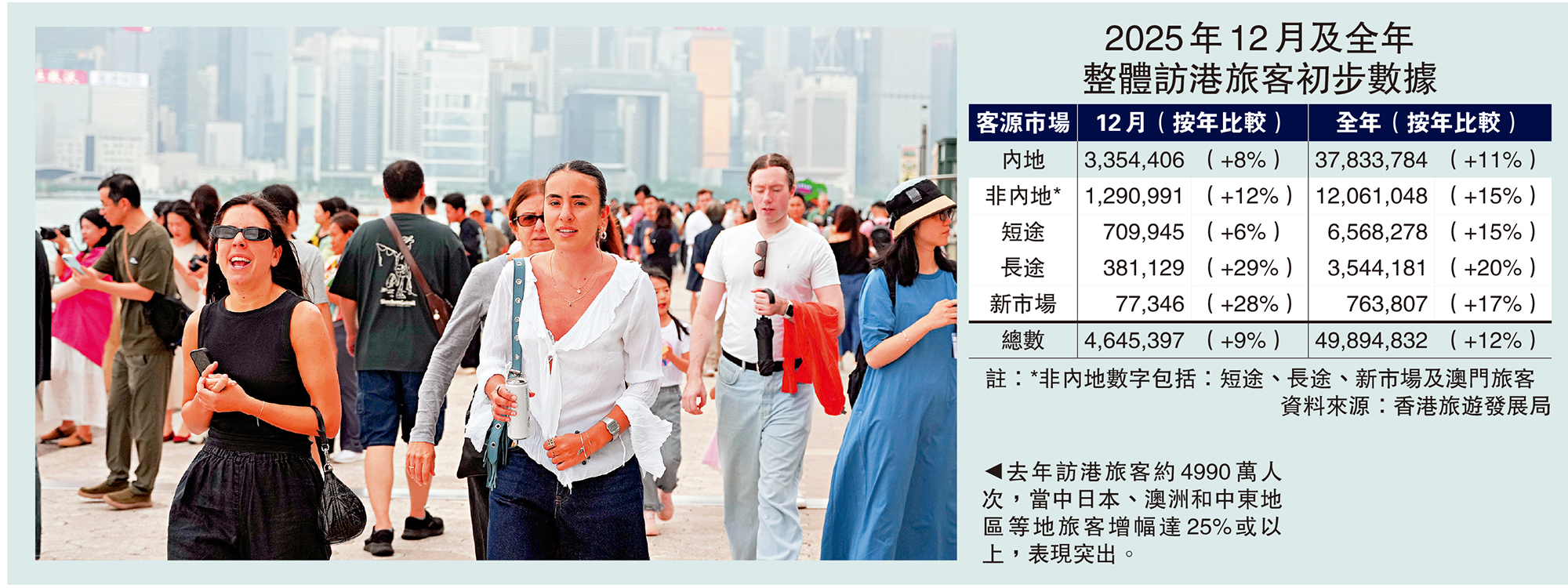 旅發局公布,2025全年共有3780萬中國內地旅客人次訪港,較2024年同期增加約11%,佔全年訪港旅客量76%。非中國內地旅客約有1210萬人次,按年增長15%,佔總旅客量24%,當中台灣、日本、越南、澳洲和中東地區的增長尤為強勁,按年增幅均達25%或以上;菲律賓、泰國、越南和印度等短途市場亦已恢復至或超越疫情前的水平。另外,去年12月訪港旅客量錄得465萬人次,較2024年同期多9%。