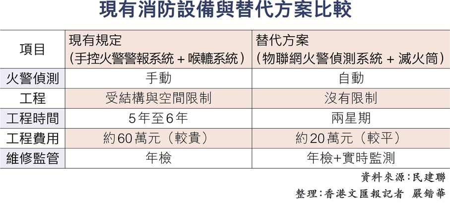 葛珮帆建議在公共區域、天井、垃圾房等關鍵點,針對火警鐘不響、消防喉沒有水、防煙門經常不關閉等異常情況安裝聯網傳感器,一旦偵測出異樣便即時推送警報至管理處和住戶手機應用程式。
