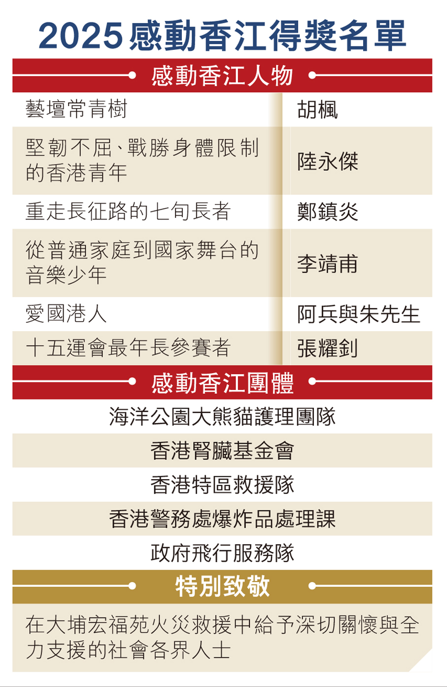 往屆感動香江人物得主、中國工程院院士陳清泉為昨日典禮任頒獎嘉賓。他認為,香港作為航運、金融、貿易及科技中心,並承擔東西方文化交流的橋樑角色,社會不僅需要經濟發展,更要文化與精神層面的力量滋養,認為「感動香江」這類活動,在香港由治及興的關鍵階段正好能為社會注入文化潤澤。