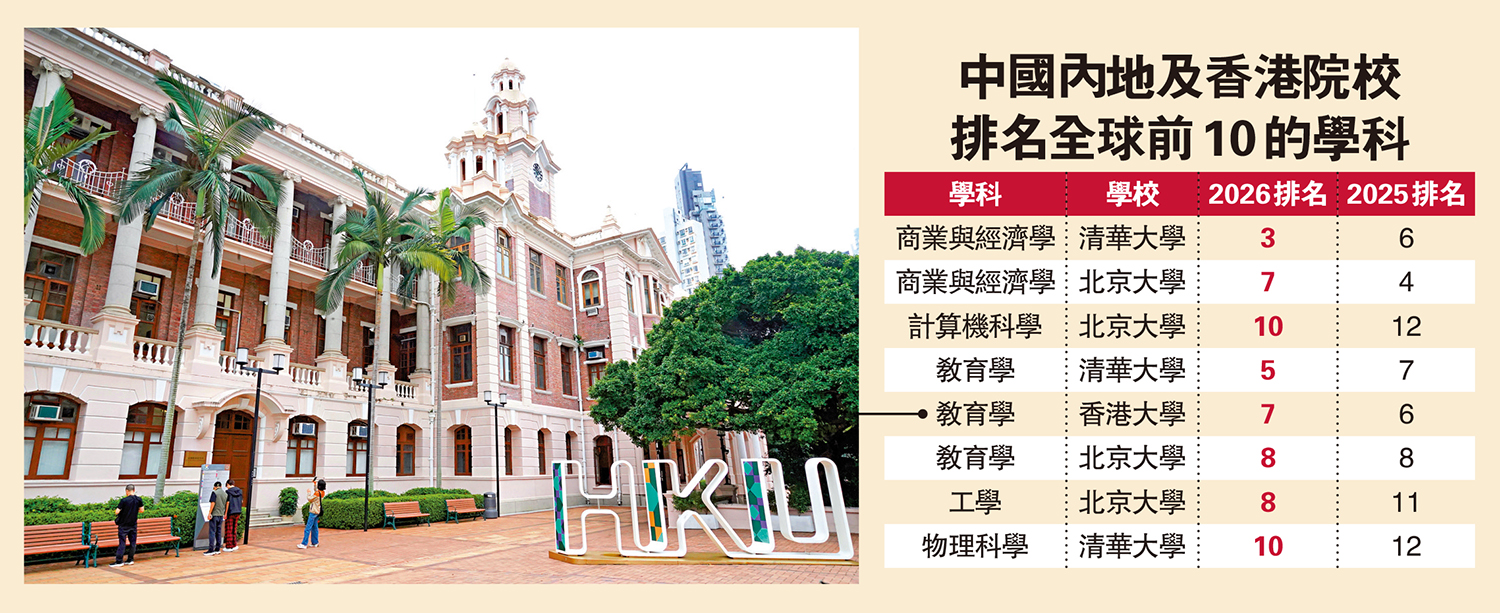 英國《泰晤士高等教育》(THE)昨公布2026年世界大學學科排名,本港7間大學在11個學科範疇都有上榜,其中3學科躋身20強,較去年多一科。其中,香港大學教育學列全球第7,與去年相比跌1位,而嶺南大學首次躋身排名榜 。
