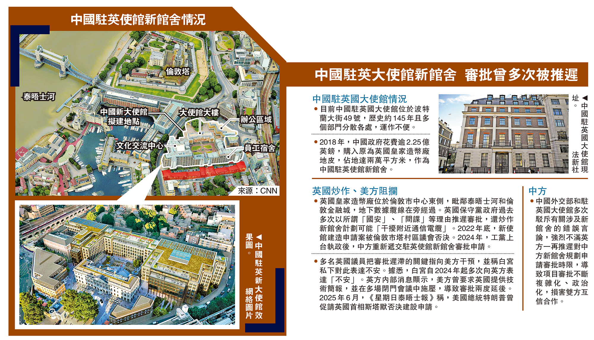•英國皇家造幣廠位於倫敦市中心東側,毗鄰泰晤士河和倫敦金融城,地下數據纜線在旁經過。英國保守黨政府過去多次以所謂「國安」、「間諜」等理由推遲審批,還炒作新館舍計劃可能「干擾附近通信電纜」。2022年底,新使館建造申請案被倫敦市塔村區議會否決。2024年,工黨上台執政後,中方重新遞交駐英使館新館舍審批申請。