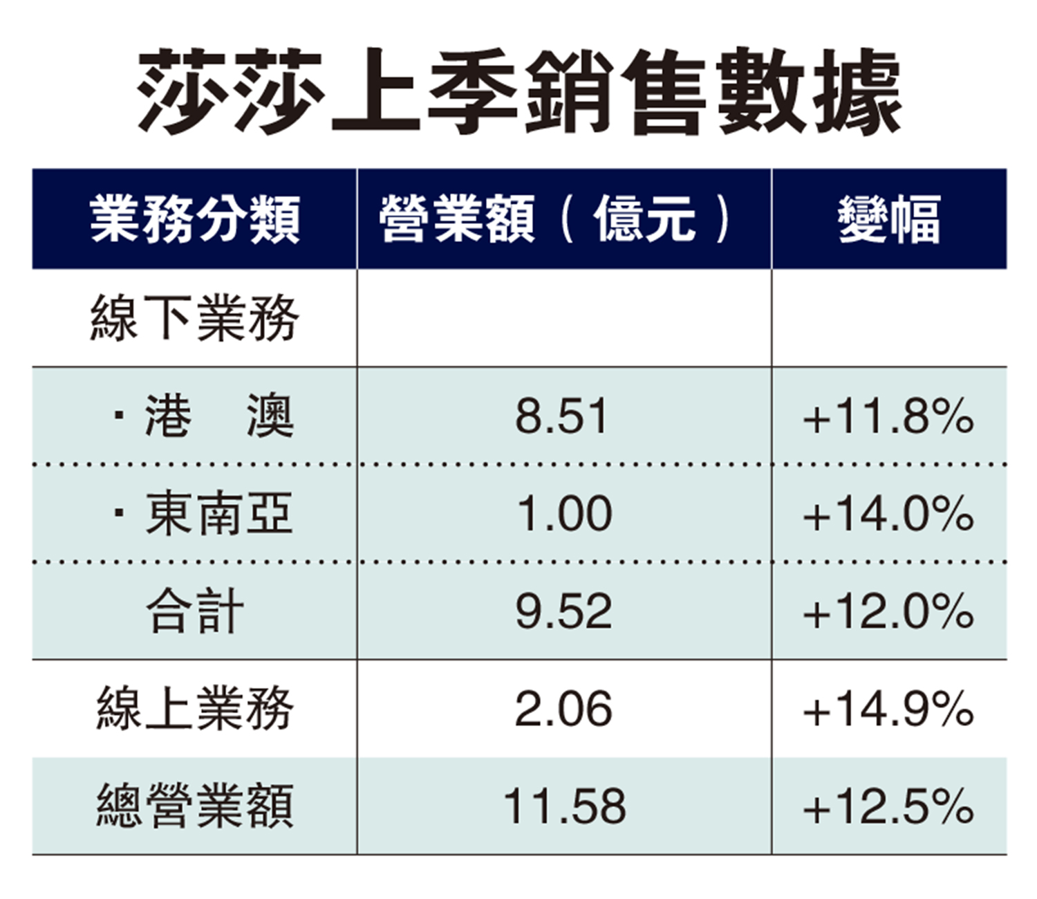 另外,東南亞線下銷售則錄得1億元,按年升14.0%。莎莎將持續留意東南亞的業務表現,相信當地業務表現還有很大的優化及提升空間。