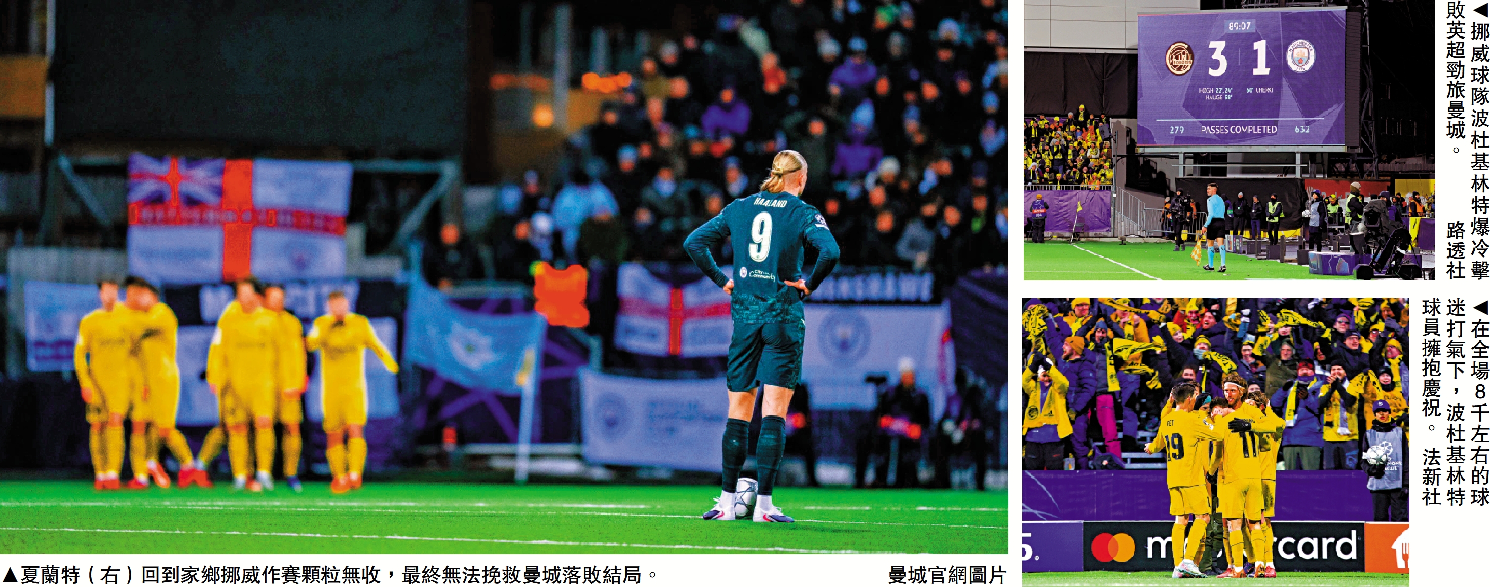 回到家鄉比賽的曼城挪威射手艾寧夏蘭特延續「新年低潮」,踏入2026年後7戰僅入1球,賽後亦坦言今場吃敗令人尷尬:「我要為自己未能入波而負上責任,並希望向每一名前來觀賽的曼城球迷致歉,因為最後戰果實在令人尷尬,不過波杜基林特踢了出色的一仗,絕對值得取勝。」曼城今場正選平均年齡為隊史在歐聯最低的24歲84天,主帥哥迪奧拿認為今仗很多細節都不利己隊,但強調從沒低估歐聯的難度。