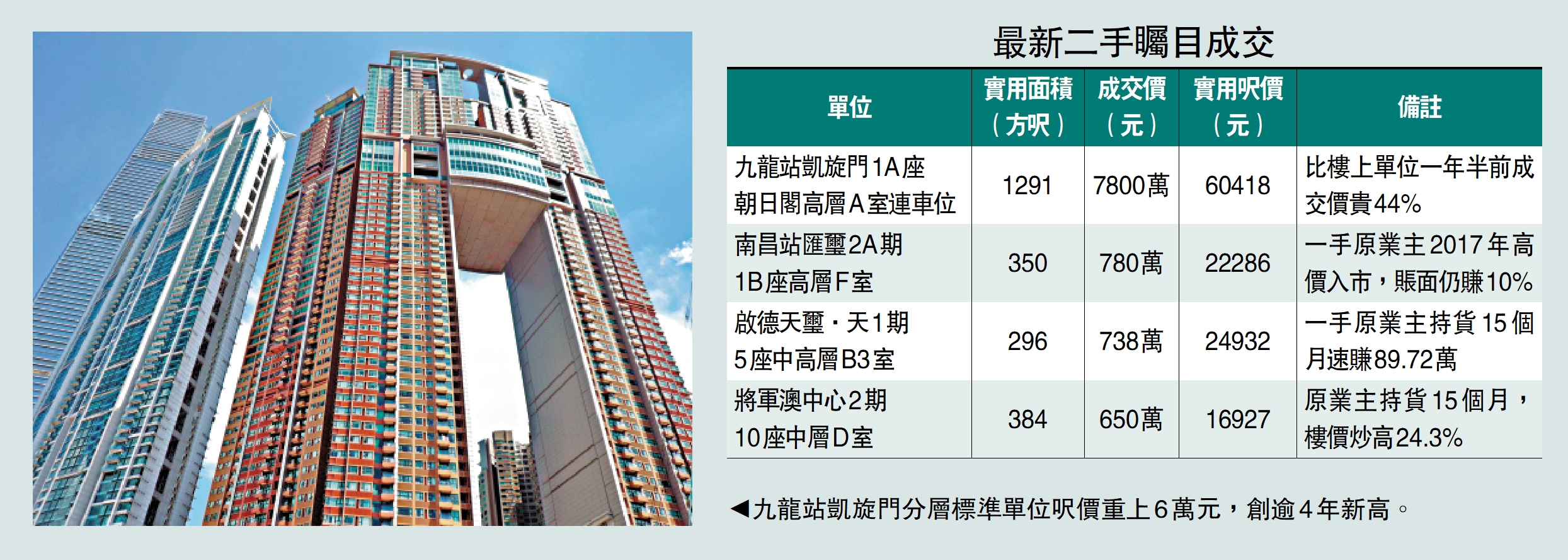 樓價重拾升軌,豪宅新盤屢獲富豪一擲千金掃貨,連帶二手豪宅也氣勢回勇,被喻為內地客「朝聖地」的九龍站凱旋門,一伙標準四房單位剛以7800萬元易手,實用呎價重上6萬元,返回2021年樓市高峰水平,創屋苑標準分層單位逾4年呎價新高,甚至比樓上單位2024年6月的成交價貴逾2400萬元,升幅達44%。\大公報記者 林惠芳