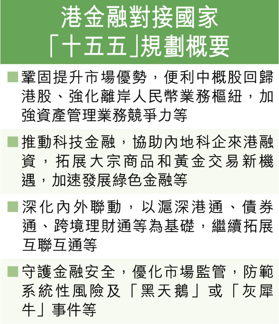 陳浩濂表示,局方會以滬深港通、債券通、跨境理財通等為基礎,在「十五五」時期繼續拓展「互聯互通」,包括推動房地產投資信託基金(REITs)納入「互聯互通」機制、推出離岸國債期貨、推進人民幣櫃枱納入港股通、優化快速支付系統互聯等,用好大灣區政策「試驗田」。
