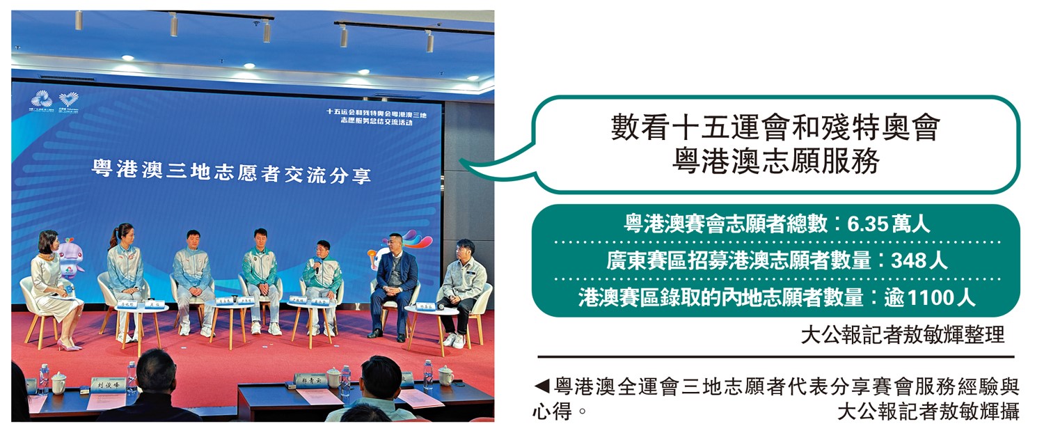 【大公報訊】記者敖敏輝廣州報道:22日,十五運會和殘特奧會粵港澳三地志願服務總結交流活動在廣州舉行,全面總結賽會期間三地志願服務工作經驗,梳理融合發展成效。