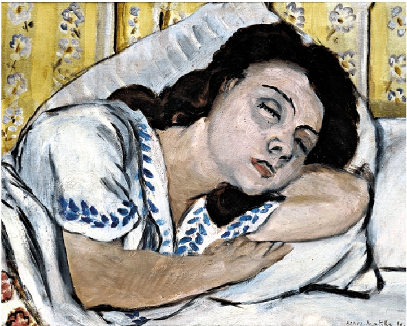 眾多作品中,一九二○年創作的《沉睡的瑪格麗特》(附圖)格外引人注目。這幅畫誕生於瑪格麗特在諾曼第海濱小鎮埃特爾塔康復期間。畫中,她安然沉睡,神情寧靜,卻隱含着苦難與堅韌。瑪格麗特自幼患白喉病,六歲時因緊急氣管切開術留下頸部疤痕,成年後多以絲帶、高領遮掩。一九二○年,她接受了修復性手術,馬蒂斯筆下的沉睡肖像,成為女兒暫獲安寧的見證。